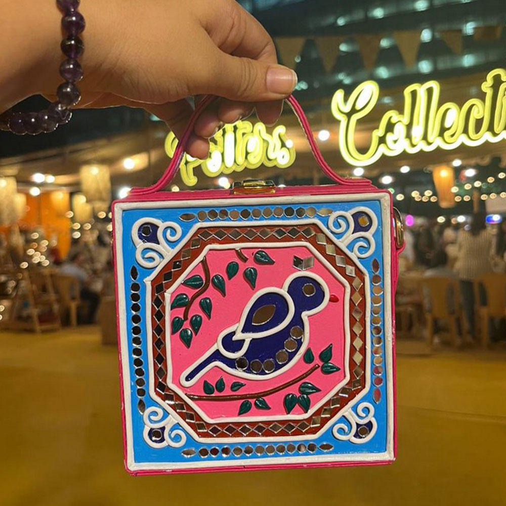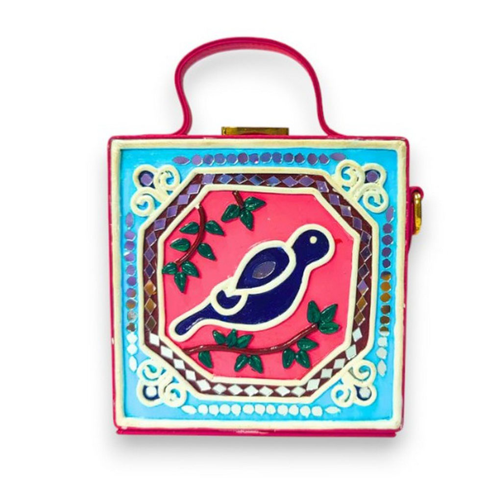 This mini sling box bag showcases bird inspired Lippan art that blends tradition with modern style. Its compact box form and mirrored details make it appealing to collectors decorators and gifters alike. Each piece is handcrafted by skilled artisans and packed and quality checked by Indianshelf.Bird Motif AccentThis charming piece features bird motifs in fine Lippan art appealing to those who love unique cultural accessories and those seeking meaningful gifts.Bird motifs are intricately formed by hand with Lippan art mirrors and clay.Entirely handmade and never machine madeCompact yet strong it serves both as an accessory and a display piece.Material and Design Facts Origin: India. Safely packed and quality checked by Indianshelf Light in weight with a convenient strap for easy wear.Creative Usage IdeasUse as a unique accessory at home or out to showcase the bird motif.Gift this bird themed bag for festivals birthdays or special celebrations.Enhance boutique displays with its artisanal bird design to attract customers.Event planners and collectors can use it as an eye catching cultural accent piece.Care InstructionsPreserve the beauty of the bird motif by storing the bag in a dry place and wiping it with a soft cloth when needed. Do not use any cleaners that could dull the mirrors or the handcrafted clay.Customer Queries AnsweredWhat is the significance of the bird design?Bird motifs symbolise freedom and are intricately applied using mirrored Lippan art.Is this bag suitable for daily wear?The piece is crafted for everyday functionality and adds charm to any look.How spacious is the interior?It holds small daily necessities like cards cash and compact makeup.Does the bag have a comfortable sling?Yes the sling is designed for comfort and can be adjusted as needed.Artisan PromiseEvery piece reflects heritage artistry and careful attention to detail. All our products are handmade never machine made ensuring individuality.