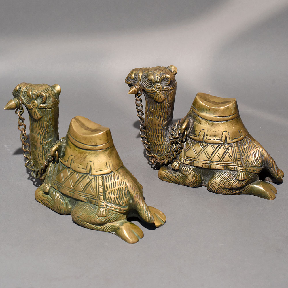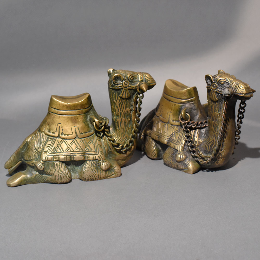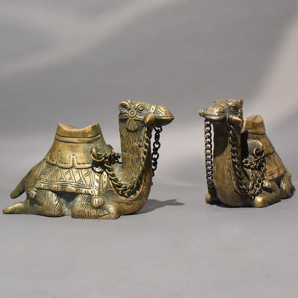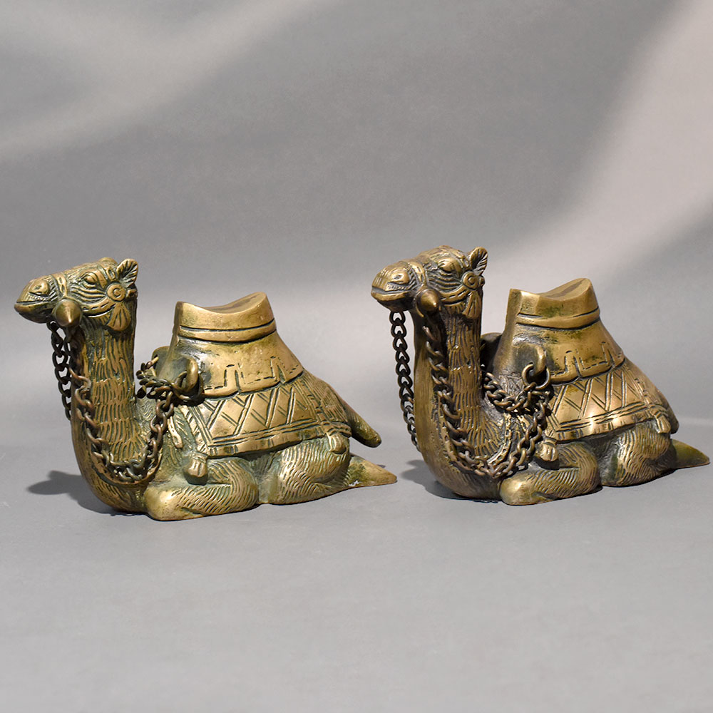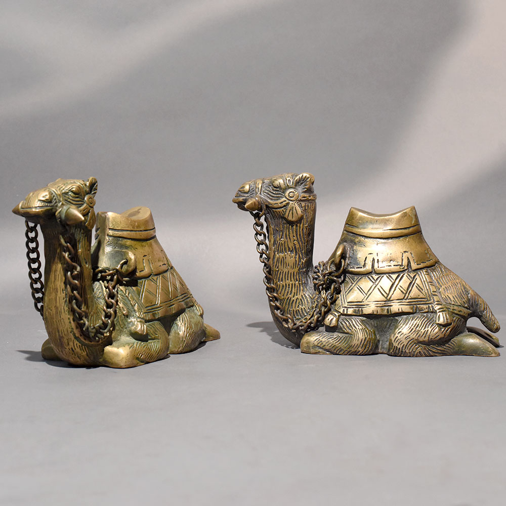 This vintage brass camel statues handcrafted pair combines decorative charm with functional design inspired by traditional desert motifs. Sculpted in a seated posture with gracefully raised heads, each camel features detailed facial carvings, textured body patterns, and ornamental saddle engravings. The integrated planter cavity on the back adds practical versatility while maintaining artistic integrity. Both camels are adorned with decorative chain accents draped along the neck, enhancing their antique-inspired appeal. The engraved saddle detailing includes geometric patterns and tassel motifs that reflect heritage craftsmanship. The subtle antique brass finish carries natural tonal variations, giving the pair a rustic yet refined presence suitable for curated interiors. Crafted from solid brass using traditional casting techniques, these handcrafted camel planters offer durability and long-lasting aesthetic appeal. Their compact size makes them ideal for small succulents, dried flowers, incense storage, or simply as decorative accent pieces. Whether styled on console tables, study desks, shelves, or ethnic-themed Decor setups, they introduce cultural richness and texture to any space. Camels symbolize endurance, resilience, and journey, making this pair meaningful beyond decoration. The dual-piece arrangement allows flexible stylingdisplay them symmetrically or place them separately for visual balance.