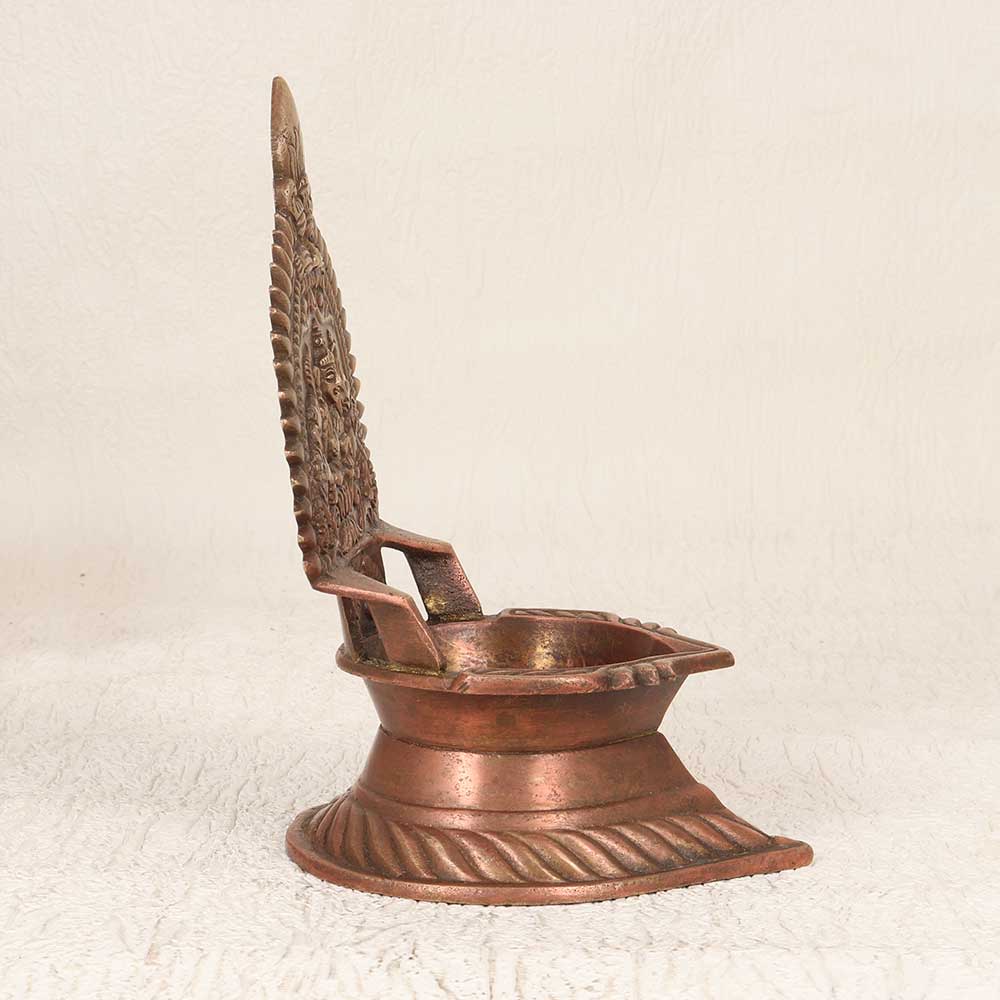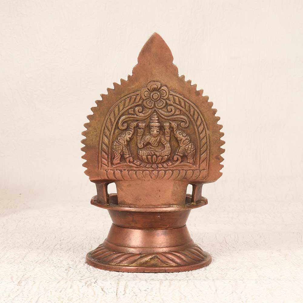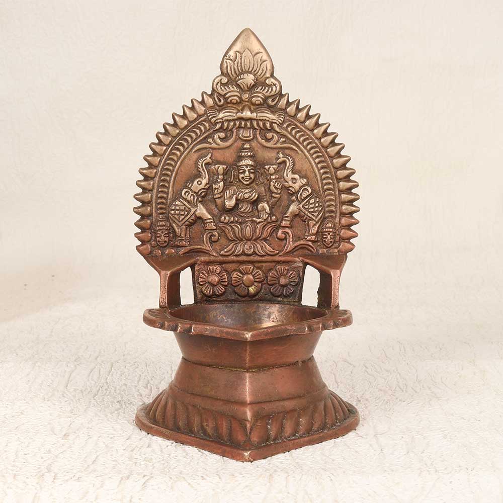 Illuminate your living space with the divine glow of this exotic Gajlaxmi brass oil lamp. Showcasing the Hindu goddess seated with her trunk turned left, this handcrafted lamp was made in the traditional style of South Indian artisans. The lamp's brass figure depicts Gajlaxmi's graceful form in fine detail demonstrating skilled craftsmanship. Lighting the lamp creates a warm, welcoming ambiance. The vintage, antique-inspired aesthetic nods to history while adding unique character to modern decor. More than just functional lighting, this lamp brings symbolic meaning into your home. Gajlaxmi represents wealth, prosperity, and good fortune. Her image graces the lamp to invite her blessings into your home. For those who appreciate Hindu iconography and want to add spiritual flair, this lamp makes an exotic statement piece. Let the goddess shine her light upon you and welcome abundance into your life.