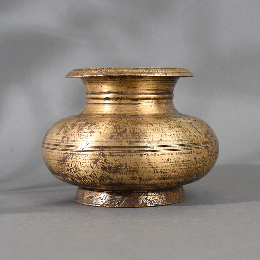 Immerse yourself in the spiritual heritage of South India with this traditional Brass Holy Water Pot (Lota), a sacred vessel used in daily rituals, temple offerings, and puja ceremonies. Handcrafted by skilled artisans, this vintage pot is made from solid brass and features a beautifully aged patina that speaks to its authenticity and cultural significance. Its rounded body and wide mouth are designed for practical use during rituals, making it ideal for storing and dispensing holy water (tirtha) or other sacred liquids. The subtle engraved lines add character, while the natural weathering gives it an antique finish that enhances its traditional charm. Whether used in religious ceremonies or as a decorative accent, this pot embodies the spiritual essence and craftsmanship of South Indian temple traditions. This brass holy water pot also serves as a meaningful collectible for devotees, antique lovers, and those seeking a genuine piece of Indian cultural heritage. Perfect for temple décor, altars, or ethnic interiors.