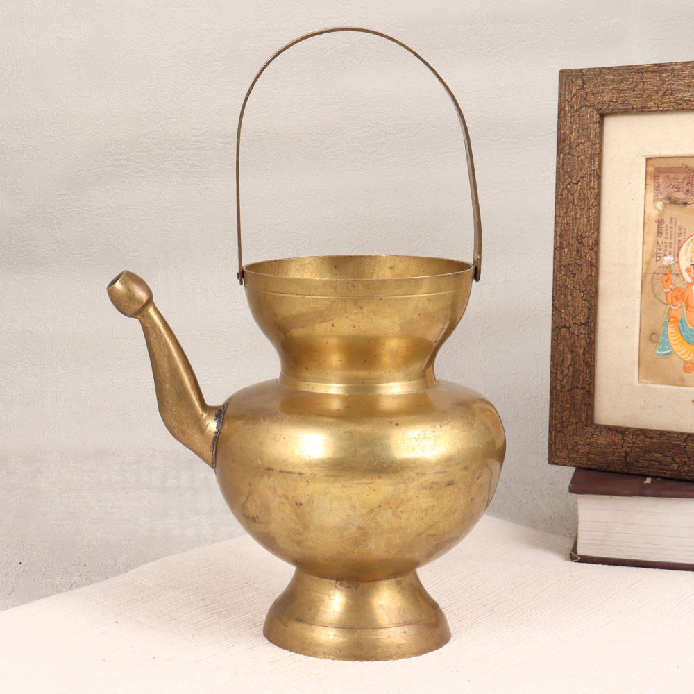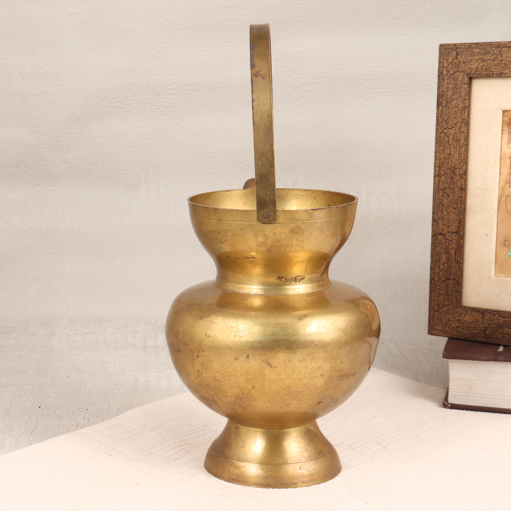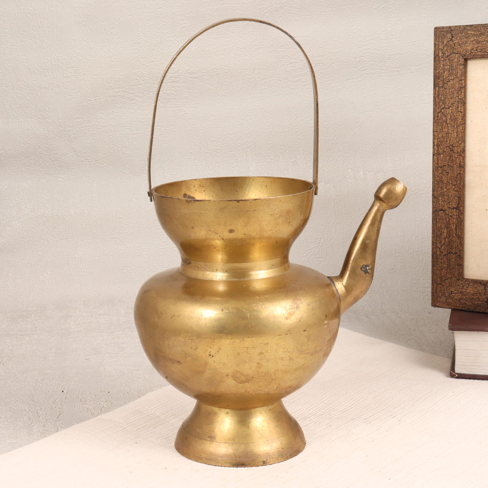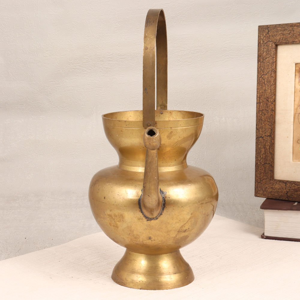 Adorn your living room with the timeless charm of our Vintage Brass Water Pot that is a magnificent Kamandal crafted by skilled Indian artisans. This exquisite piece boasts a rustic allure with its antique brown finish, highlighting the handcrafted details that make each vessel unique. The inclusion of a sturdy handle and a gracefully curved spout adds practicality and elegance to its design. Made from high-quality brass, this water pot is not only a stunning decorative accent but also a versatile addition to your spaces. Perfect for home, office, restaurant, hotel, or cafe settings, it effortlessly blends tradition with contemporary aesthetics. Embrace its multi-functional nature by using it as a distinctive flower pot, or place it at your temple for a touch of spiritual ambiance. Surprise your family, friends or relatives on special, festive, or auspicious occasions with a timeless piece that transcends trends and celebrates the artistry of Indian craftsmanship.