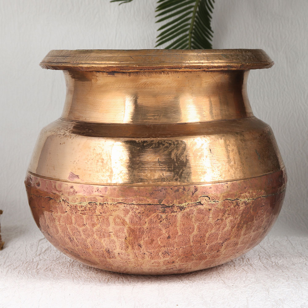 Buy a Vintage Copper Cooking Pot online which is a true masterpiece crafted with precision by talented Indian artisans. This stunning piece showcases a captivating antique golden finish that adds a touch of old-world charm to any space. Handmade with the utmost care and using high-quality copper, this cooking pot not only exudes timeless elegance but also bears the mark of exceptional craftsmanship. While it may have once graced the kitchens of yesteryears, we recommend using this vintage gem primarily for decorative purposes. Its ornate design makes it a versatile addition to any setting, whether at home, in the office, a restaurant, hotel, cafe, or even a shop. Elevate your interior decor by placing vibrant flowers or lush greenery within, transforming it into a unique and eye-catching flower pot. For collectors and enthusiasts of vintage treasures, this copper pot is a must-have addition to your collection or a stunning exhibit piece. It also makes for a thoughtful and meaningful gift to family, friends or relatives on special occasions, adding a touch of heritage and tradition to their celebrations.