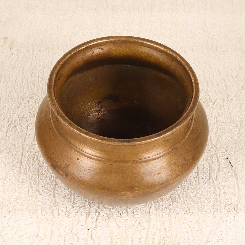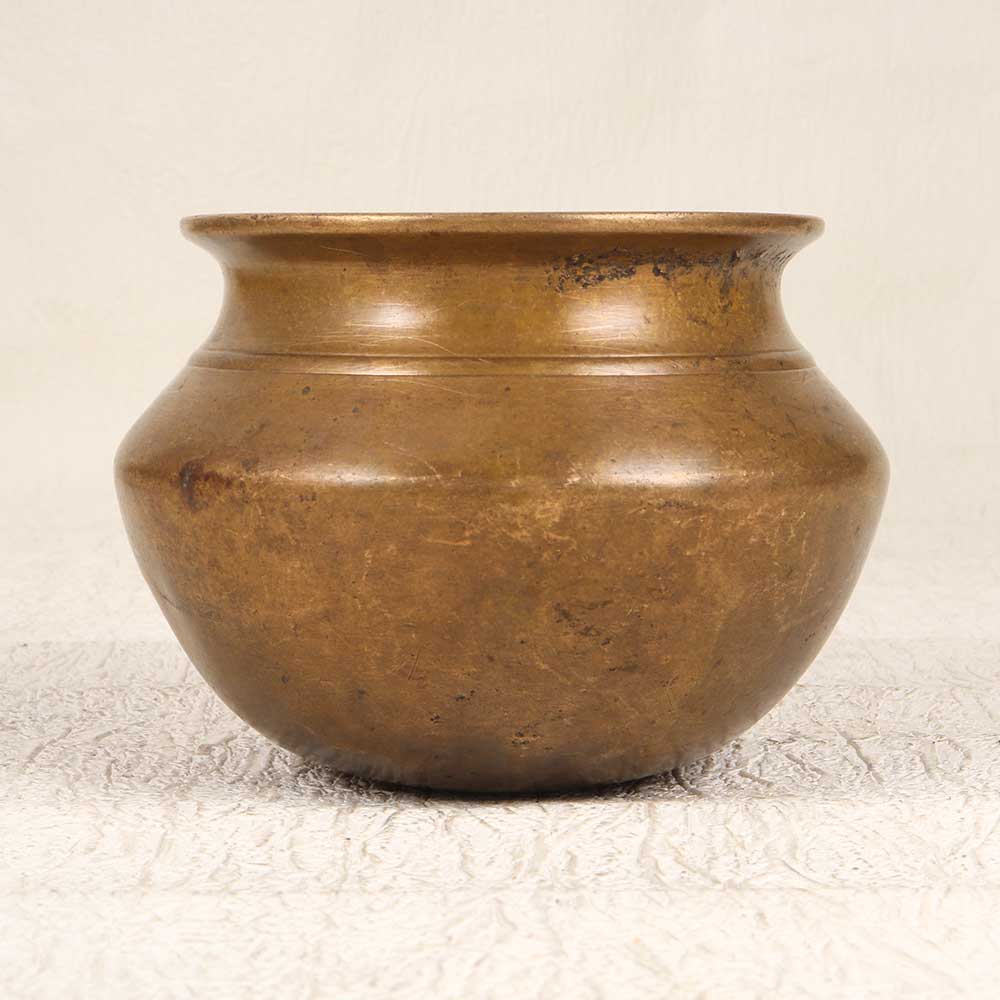 Step into the storied bazaars of old world India with this antique brass pot handcrafted in Gujarat. As a true vintage piece over a century old, this solid brass pot has a rich patina that reflects its long history. With its handsome, weathered look and detailed brasswork, this vintage pot will bring the beauty of yesteryear into your home. Use it to infuse any space with antique elegance as you display your favorite plants and blooms. Let this brass pot transport you back in time with its one-of-a-kind vintage styling and handcrafted artisanal quality that stands the test of time. For antique lovers looking for a statement piece, this vintage brass pot beautifully encapsulates the rich cultural heritage of India's skilled craftsmen. A wonderful addition to any antique collection or as a focal point in a room needing an aged patina.