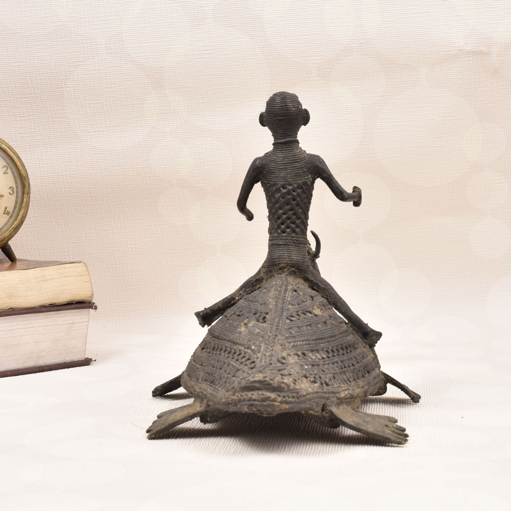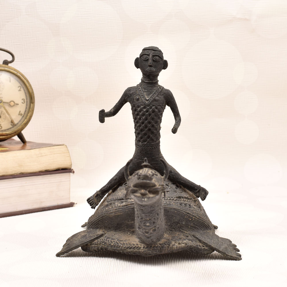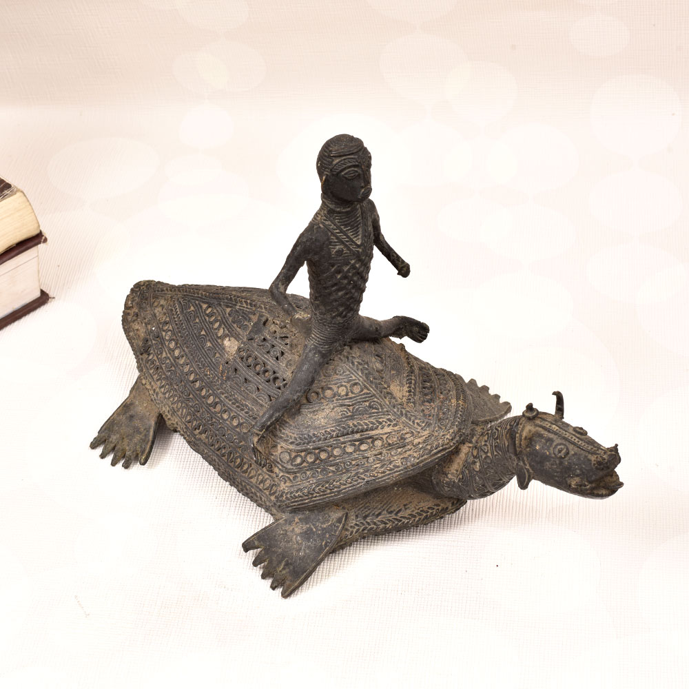 Escape to a world of wonder with this captivating brass statue of a turtle with a rider. Steeped in the rich tradition of tribal art, this one-of-a-kind piece transports you to ancient realms of mysticism and enchantment. This brass statue is more than just a decorative accent – it's a gateway to a realm of timeless stories and cultural significance. Imagine the turtle as a symbol of longevity, stability, and protection, while the rider represents the human spirit's quest for enlightenment and growth. Display this captivating piece in your home, and let it inspire you to embrace the profound lessons of the past and the boundless possibilities of the future. Whether you're a collector of tribal art or simply seeking to infuse your space with a touch of ancient wonder, this brass statue of a turtle with a rider is a must-have addition. Elevate your décor and ignite your imagination with this stunning work of art that celebrates the enduring spirit of human exploration and the timeless beauty of the natural world.