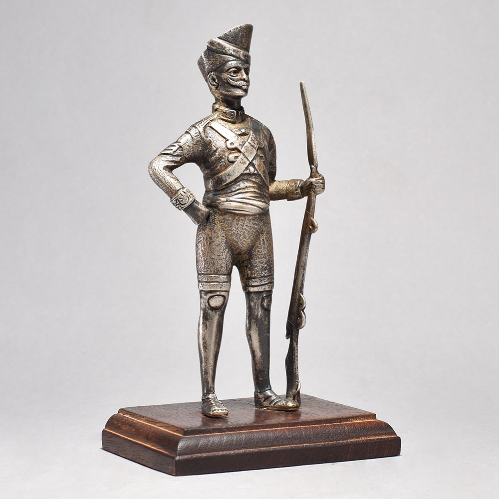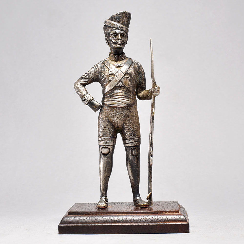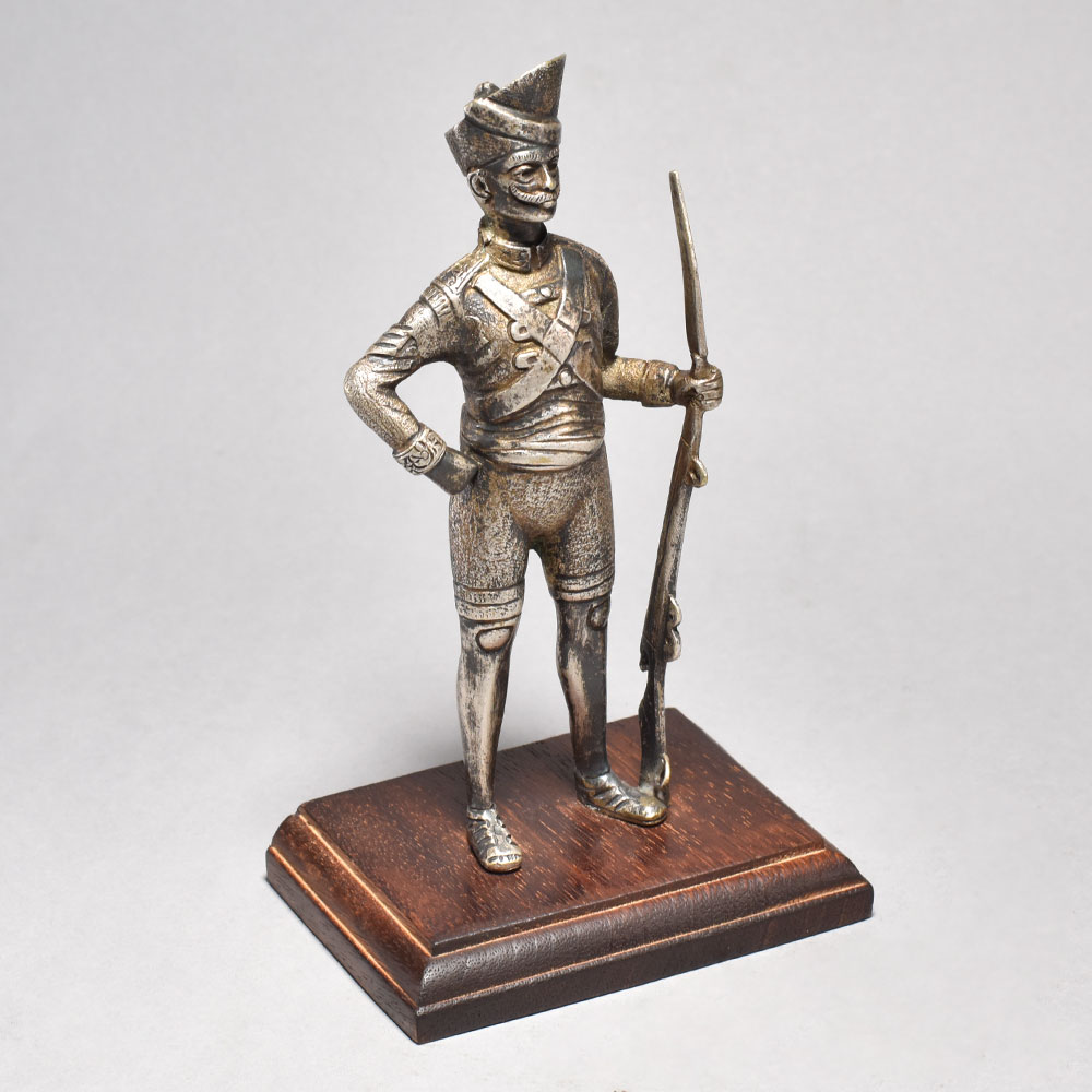 Step back in time with this stunning, handcrafted Vintage Soldier with Gun Standing on a Wooden Statue. Crafted from premium brass and hailing from England's storied past, this captivating piece brings history to life. This vintage military statue is a true testament to skilled craftsmanship. The level of intricate detail in the soldier's uniform and weaponry is simply breathtaking. Display this magnificent piece in your home or office to transport yourself and your guests to a bygone era of honor, bravery, and unwavering strength. Whether you're a history buff, military enthusiast, or simply appreciate fine art and antiques, this vintage soldier statue is a must-have addition to your collection. Infuse your space with a touch of old-world elegance and timeless charm. This timeless piece is handcrafted by skilled artisans using time-honored techniques, ensuring each creation is truly one of a kind. Its versatile design makes it suitable for living rooms, bedrooms, offices, or meditation spaces, bringing a sense of heritage and style wherever it is displayed.