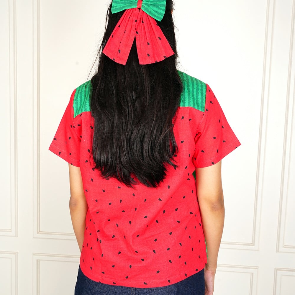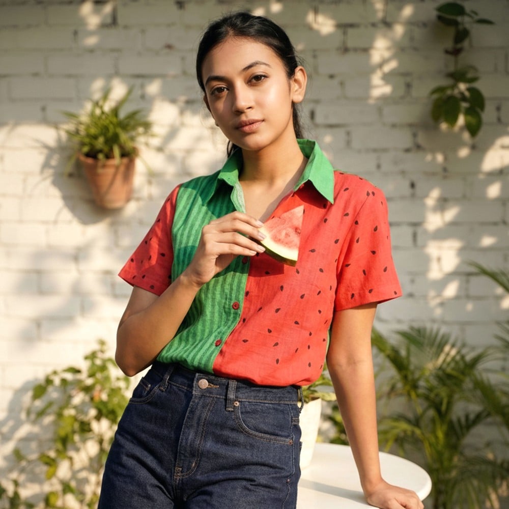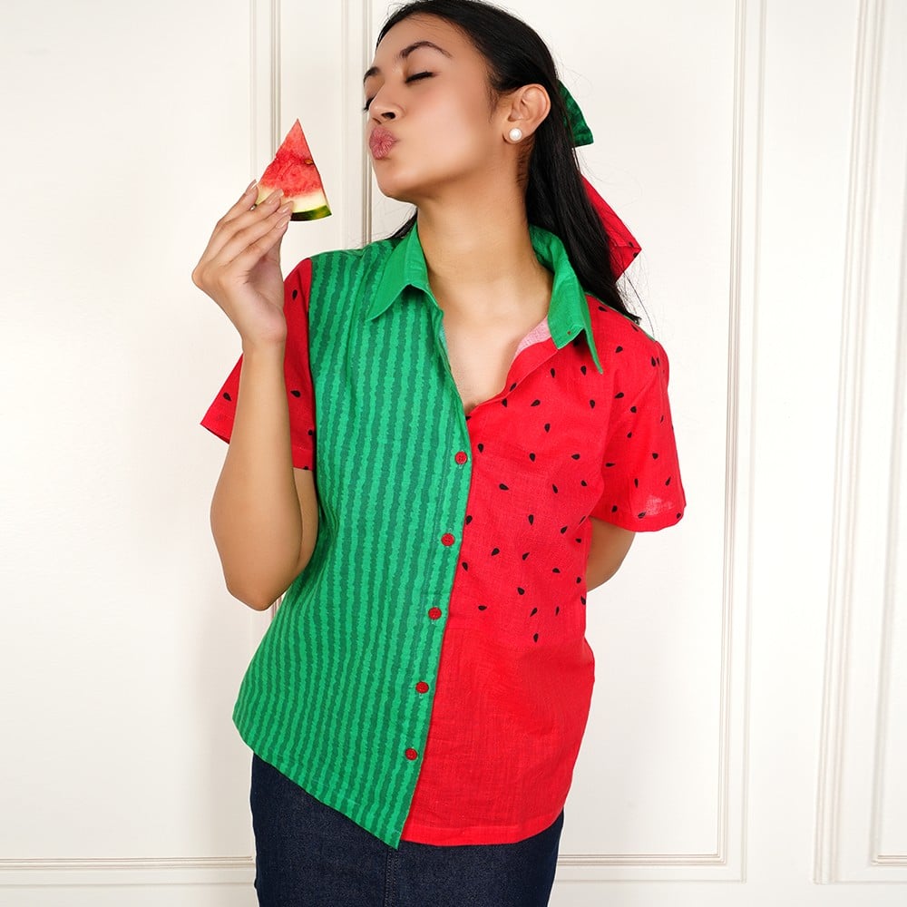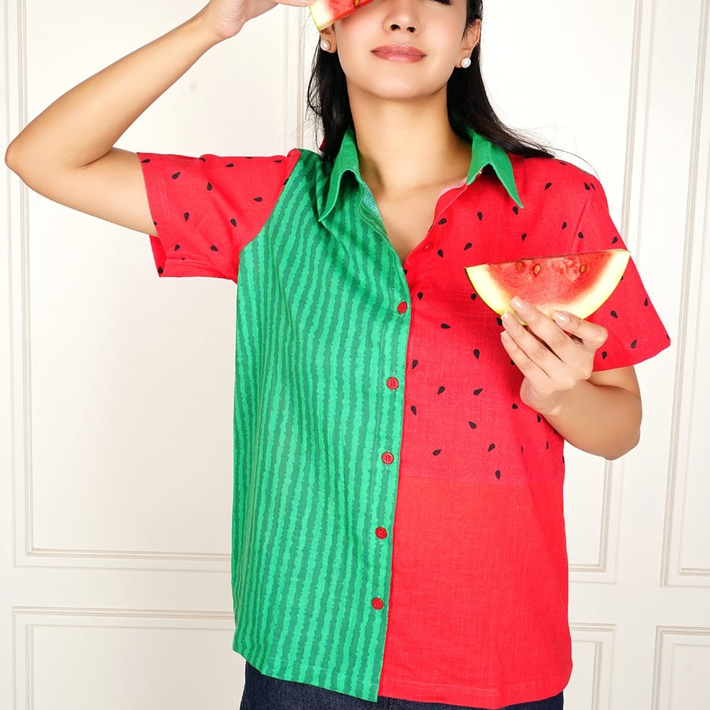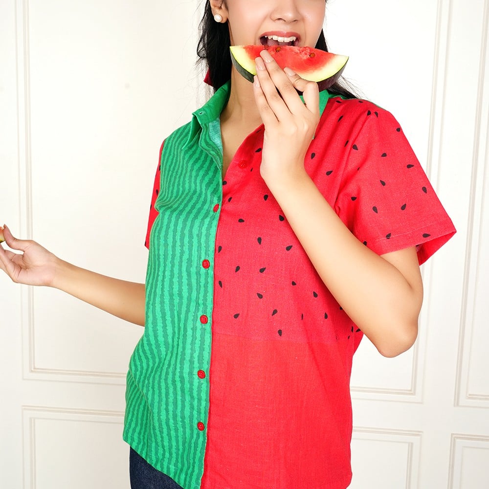 This handcrafted watermelon print cotton shirt is designed to bring a fun and playful twist to everyday fashion. Inspired by fresh watermelon tones, it features a unique half-and-half design with green striped patterns and vibrant red fabric with seed prints, creating a bold and refreshing look.