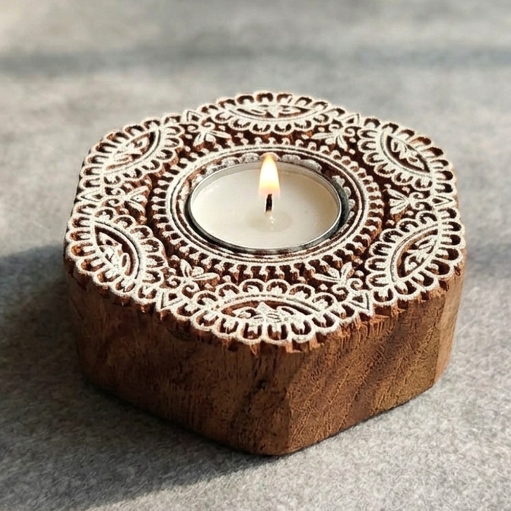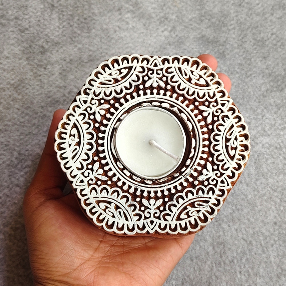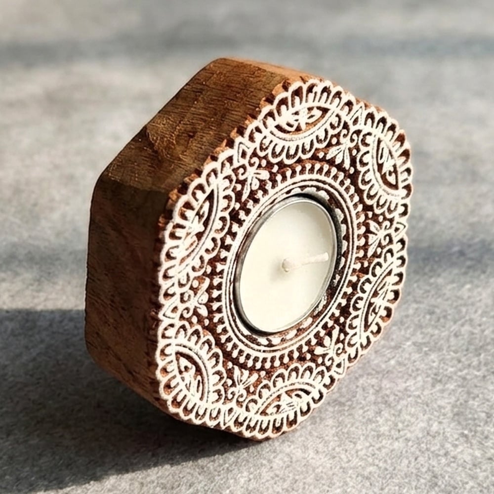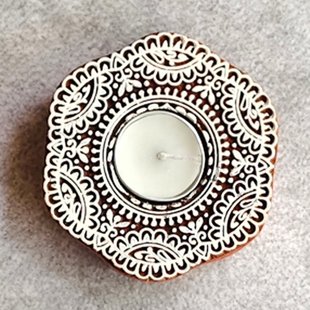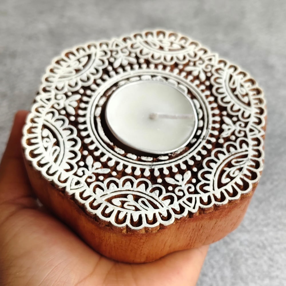 This beautiful handcrafted wooden T light decor piece features an intricate floral carving that enhances its aesthetic appeal. Designed to hold a T light candle, it creates a warm, soothing glow while adding a touch of elegance and craftsmanship to your living space.