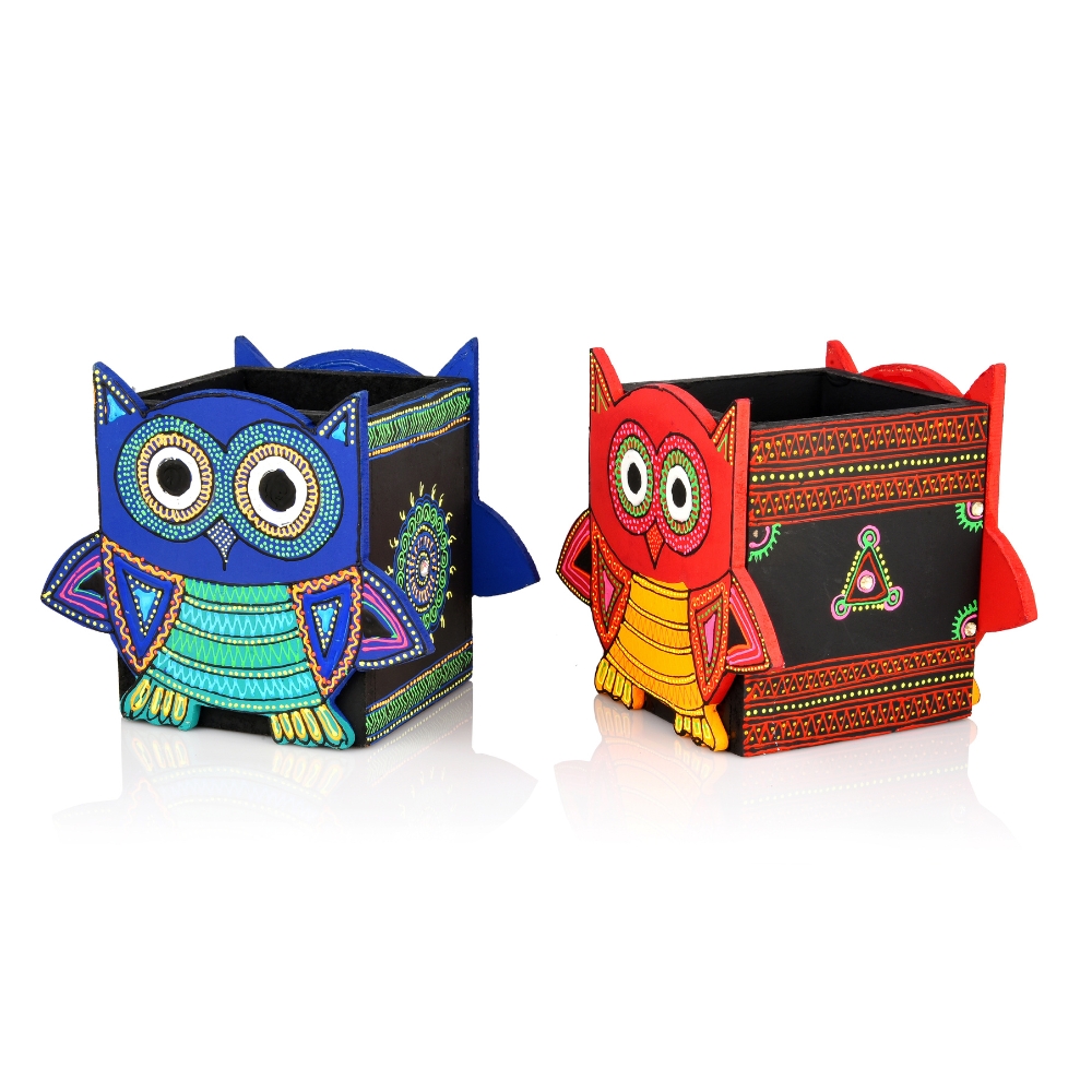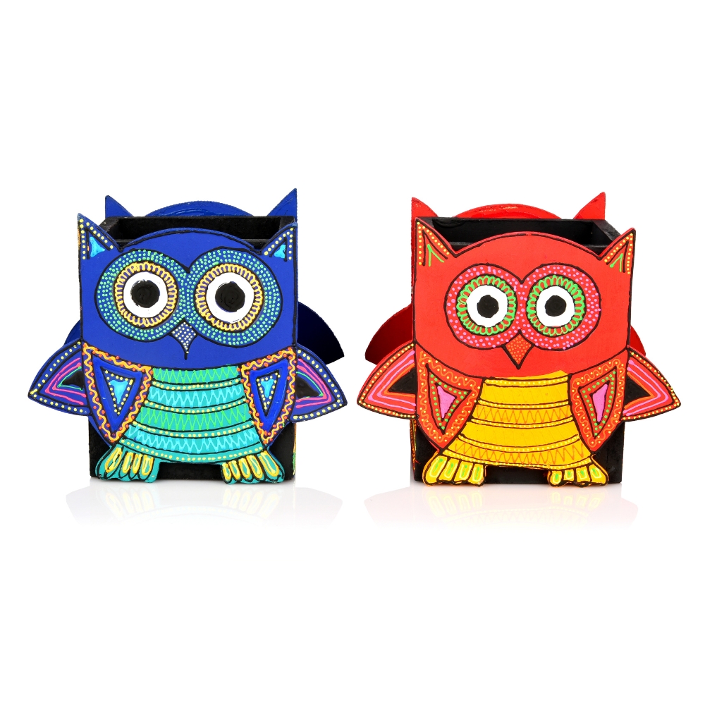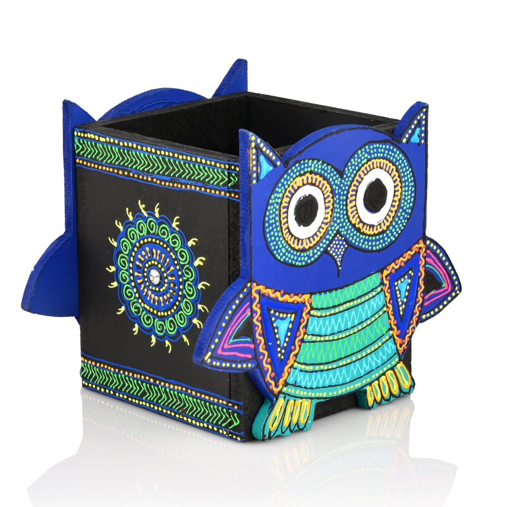 This handcrafted wooden owl motif pen stand adds playful character and practical storage to desks and shelves. The carved owl form paired with hand painted detailing brings a lively visual appeal while keeping stationery neatly organized. Designed for workspaces gifting and decorative use this pen stand reflects skilled artisan craftsmanship. Packed and quality checked by Indianshelf.
