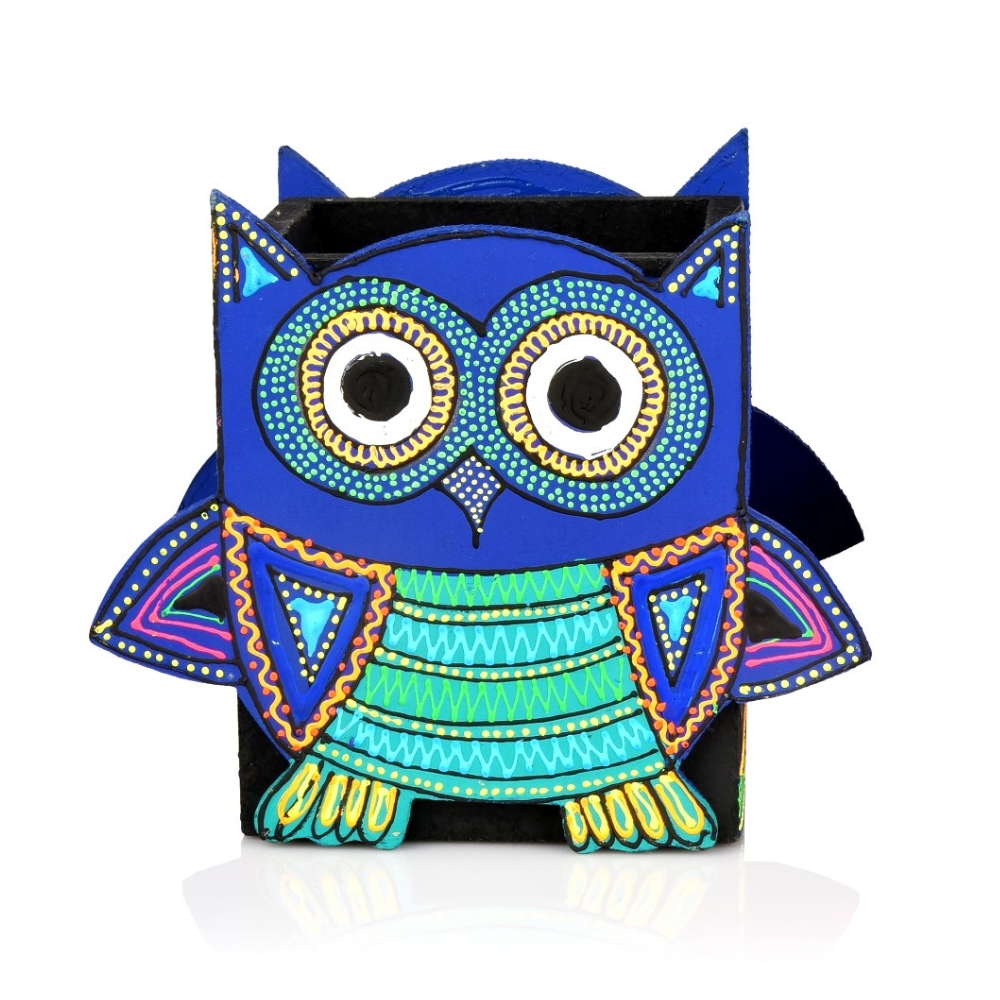 The pen stand features a sculpted owl silhouette highlighted with vibrant hand painting creating a functional desk accessory that also serves as a decorative accent.