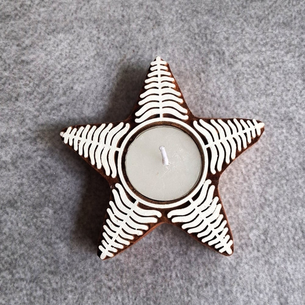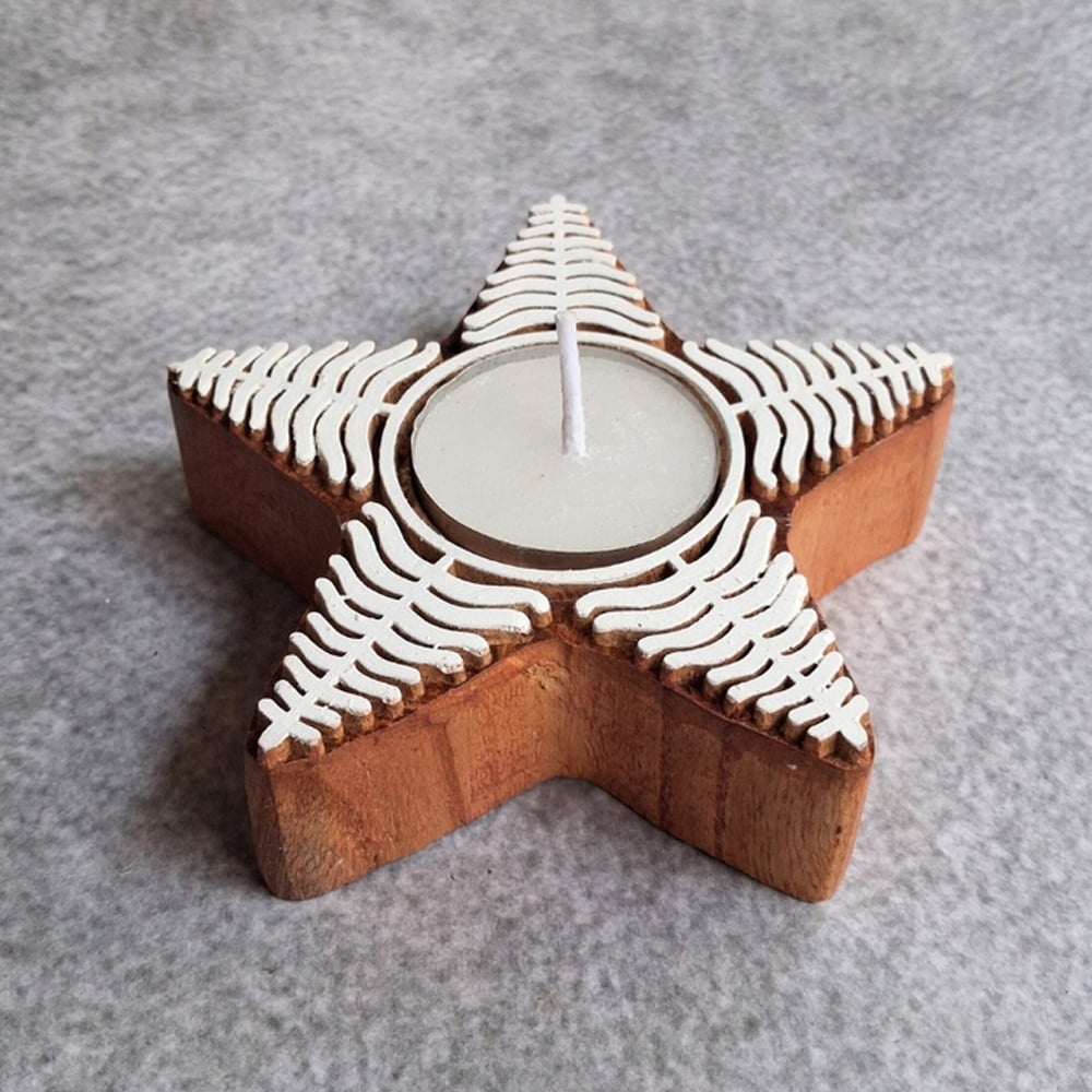 This handcrafted wooden star T light candle set of 5 showcases a beautifully carved star silhouette with intricate white detailing. Designed to hold T light candles, this set creates a warm, inviting glow while enhancing your decor with artisanal charm.
