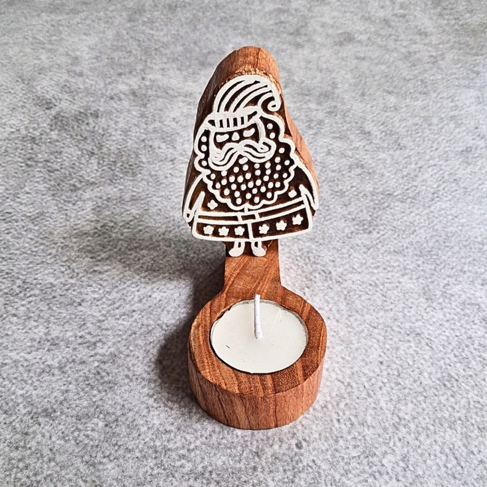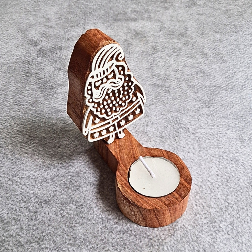 This handcrafted wooden T light candle holder set combines traditional artistry with functional design. Featuring a carved wooden base with a decorative block figure and a built-in holder for T light candles, this set of 5 pieces adds warmth and character to your decor.