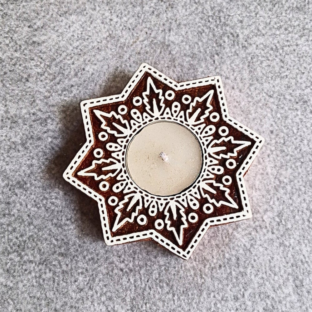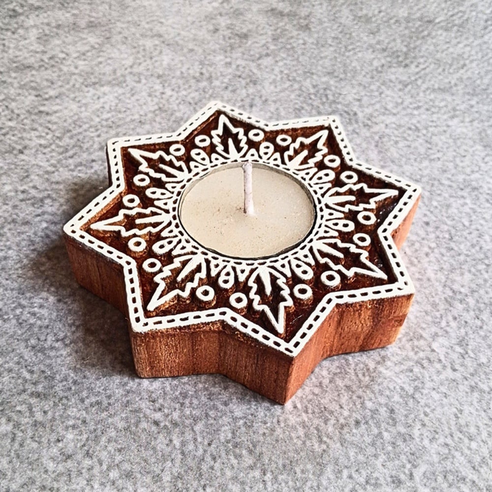 This handcrafted wooden T light candle set of 5 features a beautifully carved star-shaped design that combines traditional artistry with warm ambient lighting. Each piece holds a T light candle, creating a soft glow that enhances your home decor.