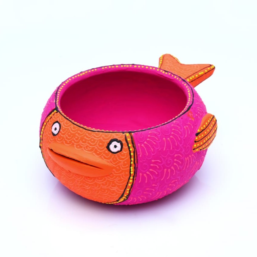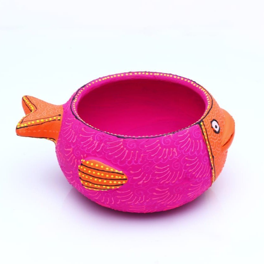 Add charm and creativity to your festive décor with this Handicraft Terracotta Fish Diya in Pink. Crafted from natural clay and finished in a soft pink tone, this diya is shaped like a fish, symbolizing abundance, fertility, and good luck in Indian tradition. Compact yet eye-catching, it doubles as a tealight holder for Diwali, puja rooms, or unique gifting.