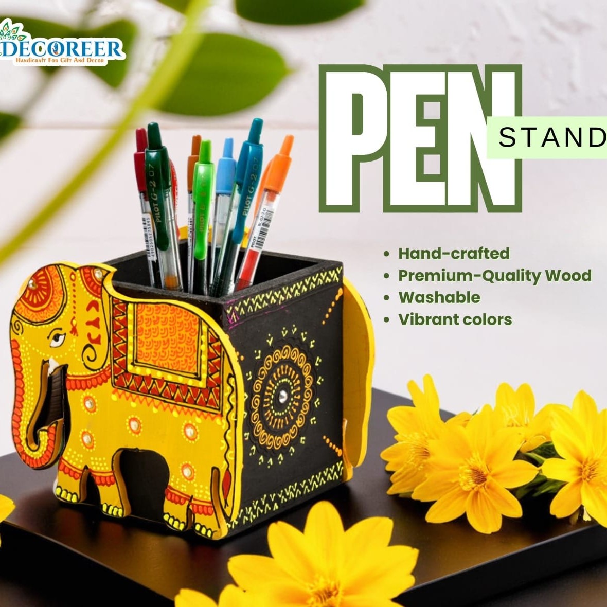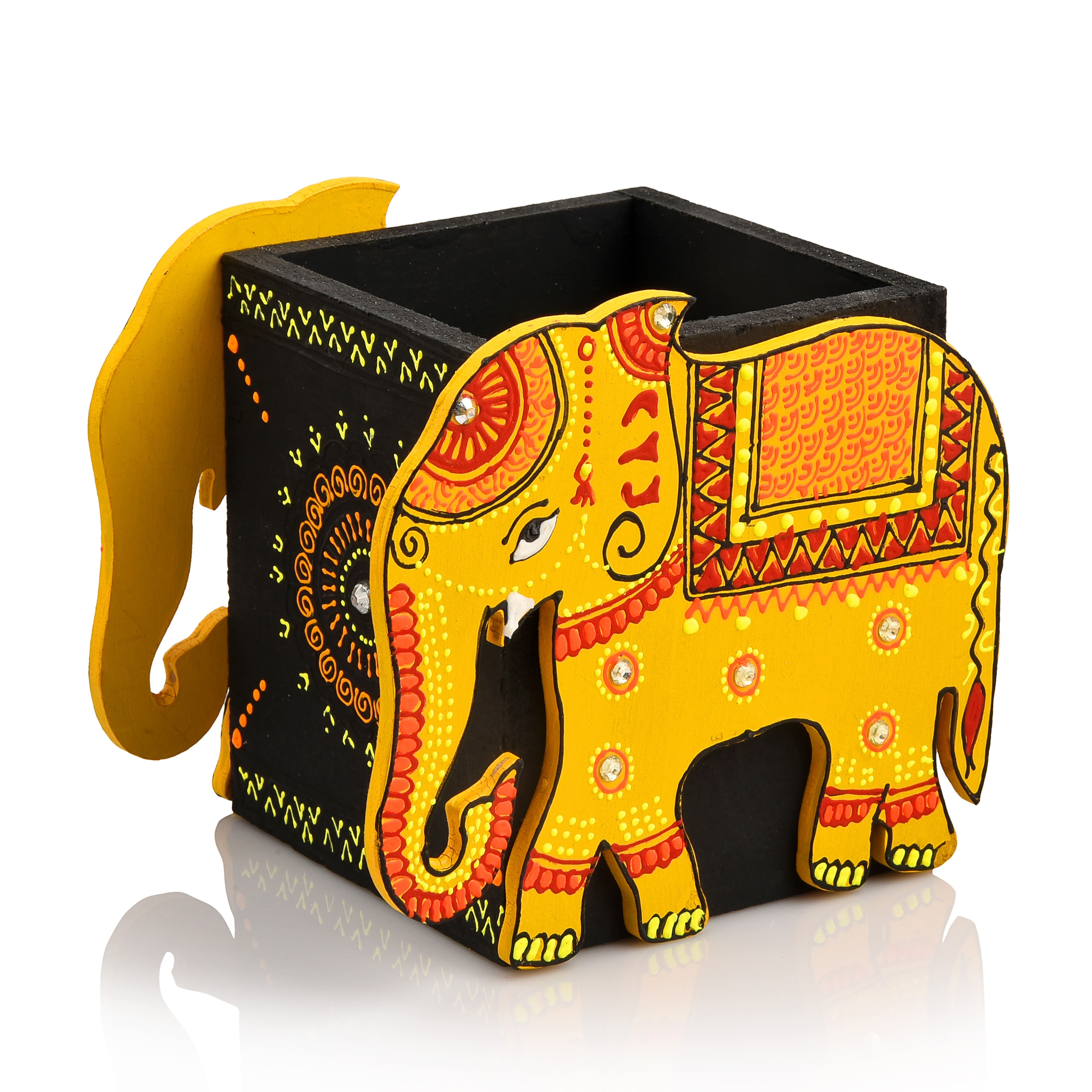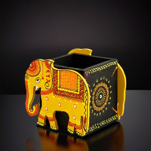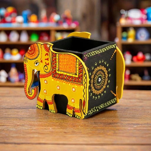 Brighten up your desk with this charming handcrafted yellow wooden elephant pen stand, inspired by traditional Indian folk art. Painted in vibrant shades of yellow, orange, and red, this pen holder features intricate mandala motifs and fine detailing on the elephant’s body and saddle. Perfect for storing pens, pencils, makeup brushes, or even cutlery, this versatile piece doubles as both a utility item and a decorative accent. Ideal for home, office, or gifting, this elephant-themed wooden stand adds a pop of color and culture to any space.