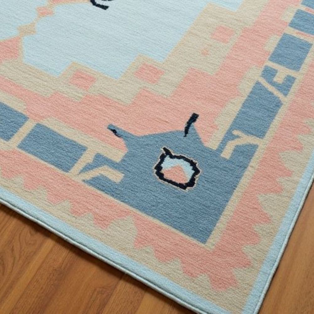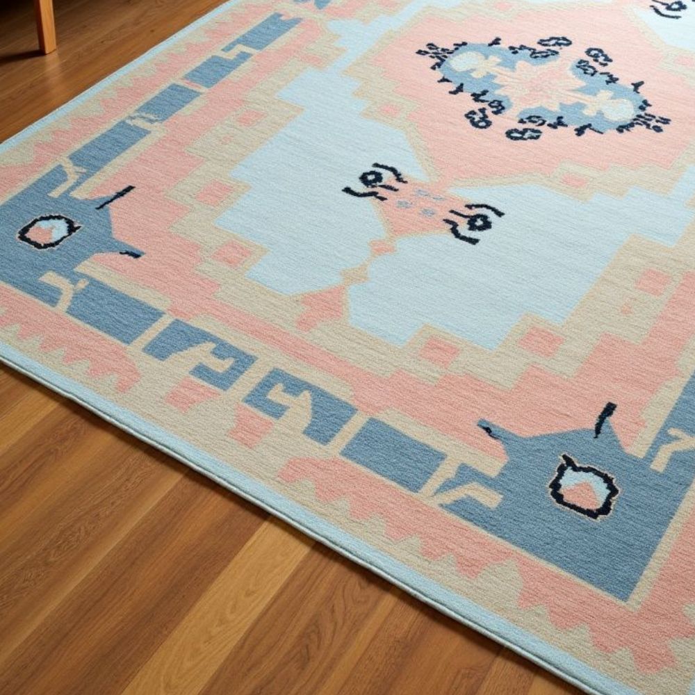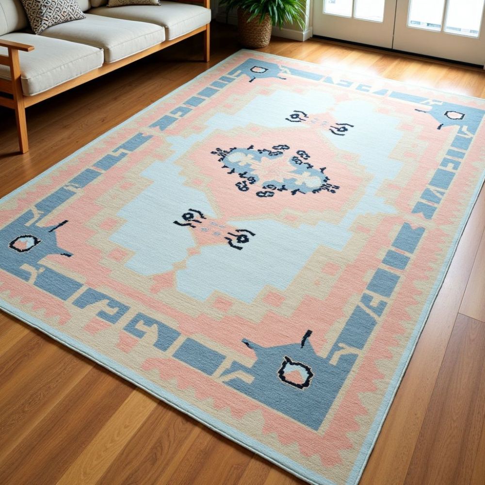 Featuring a serene combination of blush peach, sky blue, ivory, and charcoal, this rug showcases a simplified tribal Oushak design with geometric detailing and a central medallionmaking it a versatile fit for both classic and contemporary interiors. Every knot is tied by hand by skilled artisans, ensuring unmatched durability, texture, and heritage value. The use of premium quality wool adds a soft, warm touch underfoot while offering natural stain resistance and longevity. Product Details: Design: Modern Oushak-inspired tribal motif Color Palette: Blush Peach, Sky Blue, Ivory, and Charcoal Accents Material: 100% Hand-Spun Wool Construction: Hand-Knotted (Approx. 80100 knots per sq.