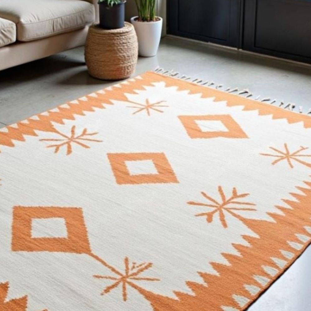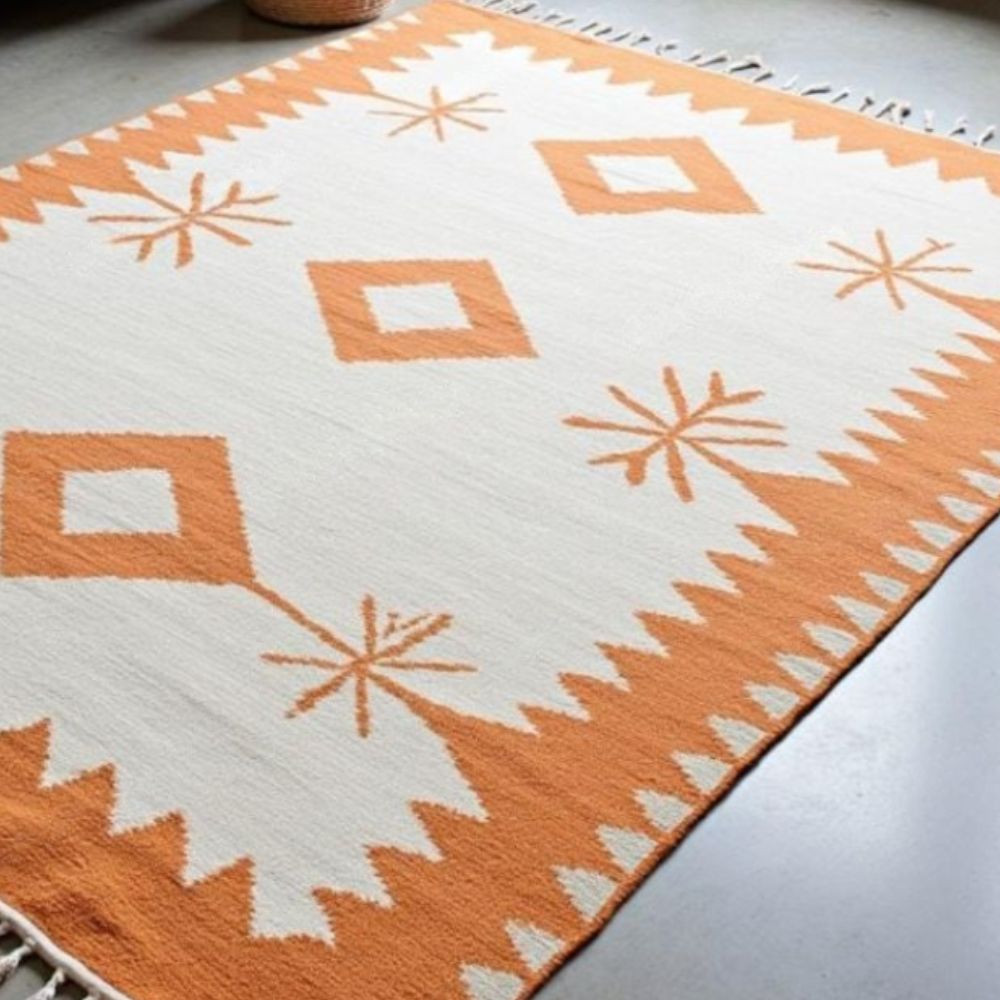 Highlights (Bullet Points): Handwoven by Skilled Artisans Each rug is crafted using traditional weaving techniques for unmatched authenticity and durability. Vibrant Geometric Starburst Pattern Features a bold orange and cream palette with diamond and star motifs for a cheerful, uplifting vibe. Premium Wool & Cotton Blend Natural fibers offer softness, resilience, and easy maintenance. Flatweave Construction Lightweight, reversible, and perfect for layering in boho, Southwestern, or modern interiors. Decorative Tassel Edges Adds a playful, artisanal finish that enhances the rugs handcrafted charm. Versatile Sizing Available in multiple sizes to suit living rooms, bedrooms, studios, or entryways. Ethically Made & Eco-Friendly Sustainably sourced materials and fair trade production. This flatweave beauty showcases a bold orange and cream color scheme adorned with diamond and starburst motifs, perfect for adding warmth and personality to your home. The hand-tied tassels on each end bring a charming, boho-inspired touch, while the flatweave wool and cotton blend construction makes it lightweight, durable, and reversible. Whether styled under a coffee table, layered in a cozy reading nook, or used to anchor a living room, this rug is.