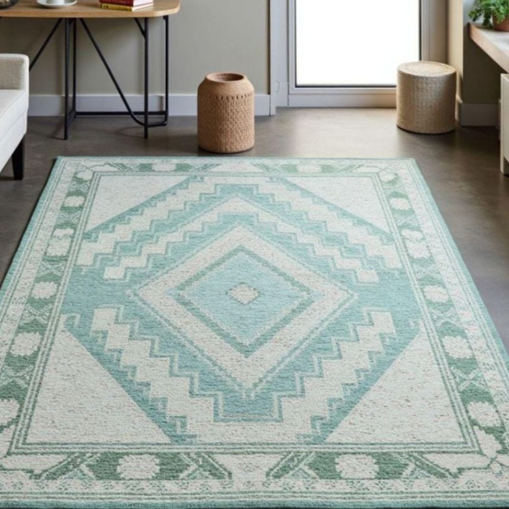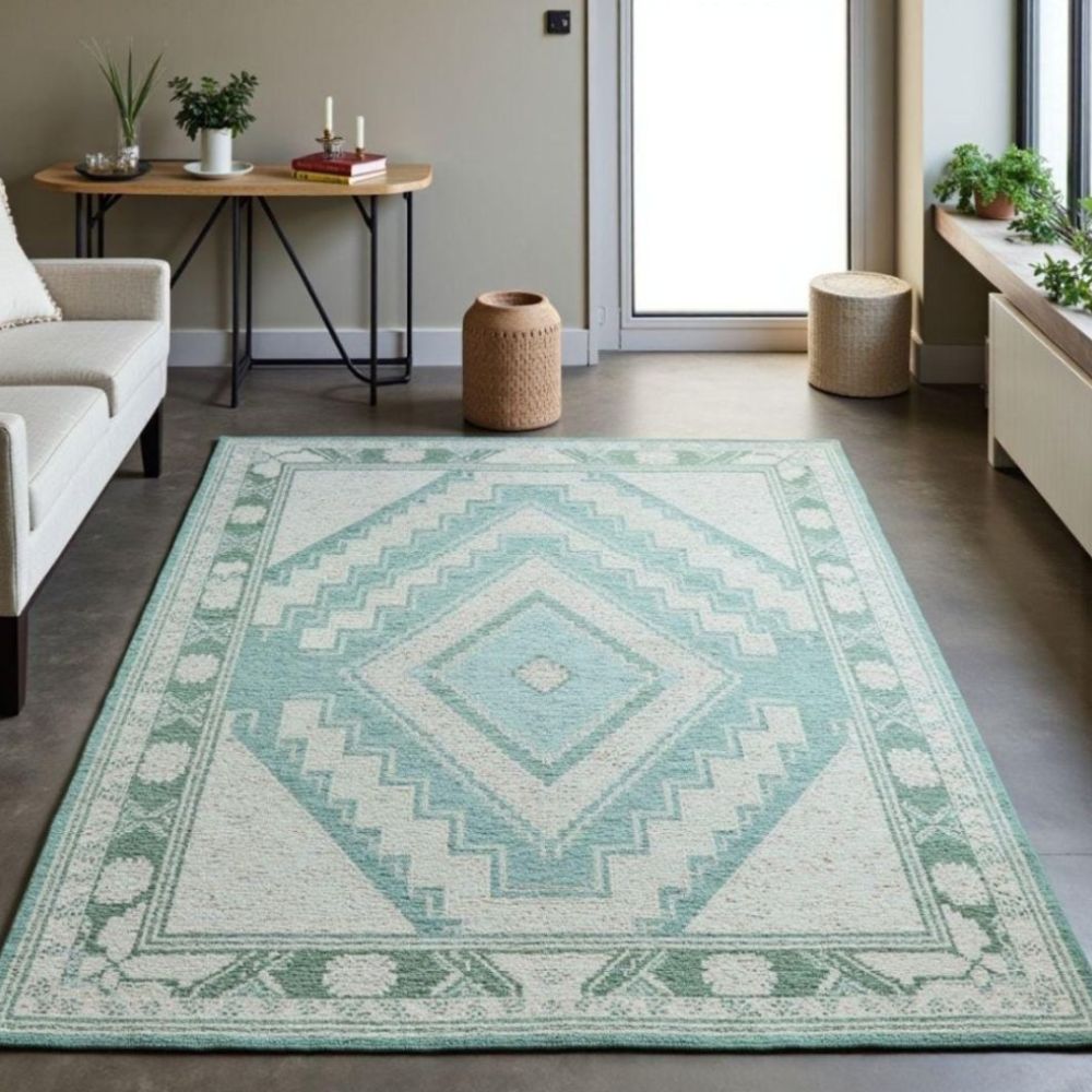 Hand-Knotted Geometric Wool Rug Modern Tribal Design in Aqua & Ivory Bring elegance and warmth to your home with this beautifully hand-knotted rug, crafted with timeless artistry and durable quality. Details & Features: Type: Hand-Knotted Rug (Not Flatweave) Design: Geometric Diamond & Tribal Border Colors: Soft Aqua / Teal & Ivory (natural tones, easy to style) Material: Premium Wool & Cotton Foundation Durability: Made to last for generations with fine knotting techniques Feel: Soft underfoot with a natural, cozy texture Use: Ideal for modern, bohemian, coastal, or minimalist interiors Why Youll Love It: 100% Handcrafted by skilled artisans Each piece is uniqueno two rugs are ever the same Eco-friendly, sustainable, and made from natural fibers Adds warmth, charm, and character to any space Care Instructions: Vacuum regularly (without beater bar) Spot clean with mild detergent Professional rug cleaning recommended for longevity As it Appears Pack of One Piece.