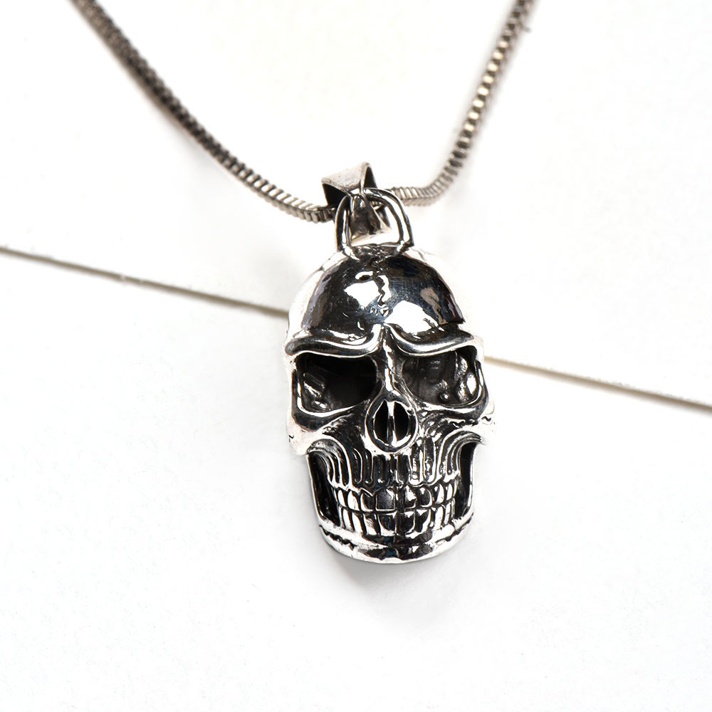 Handmade 92.5 Sterling silver pendant in the shape of a human skull where you can see the entire face . This pendant is an ideal gift on Halloween , birthday party , your friends and relatives who love some thrill in life .It is an all time favorite with youngsters and teenagers and kids too.