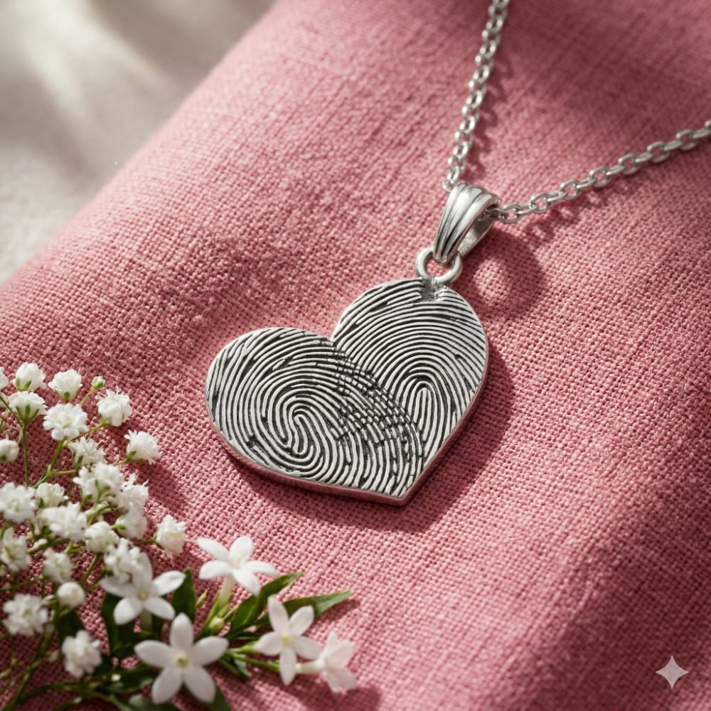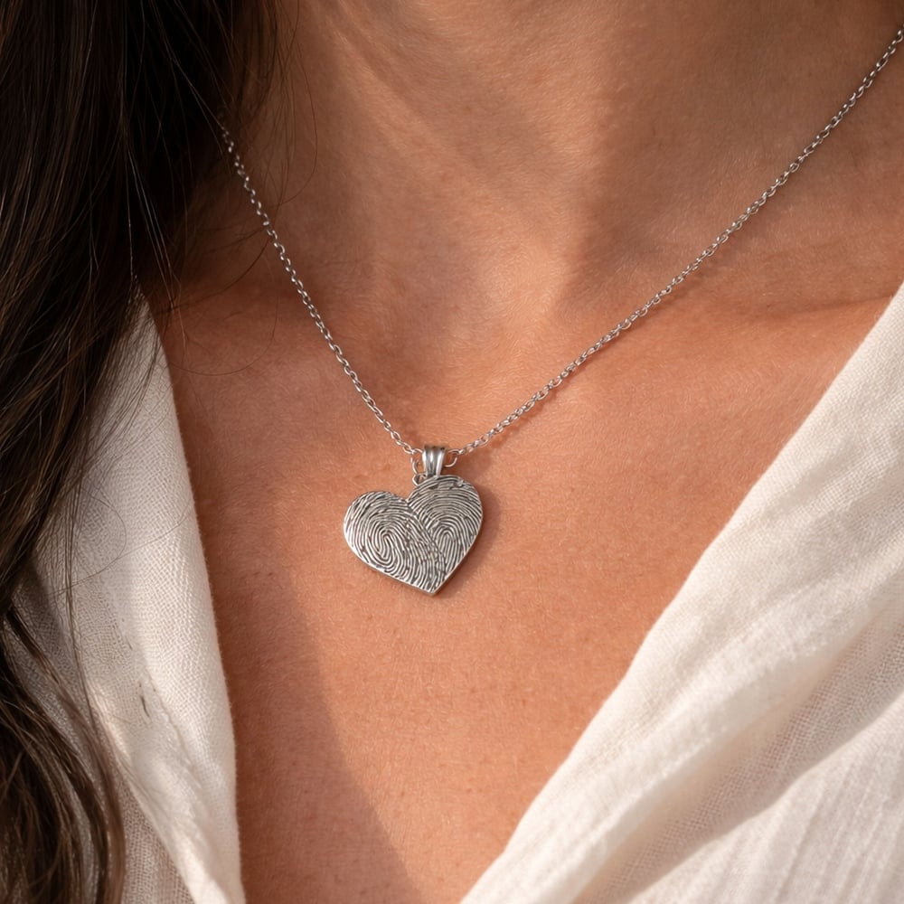This handmade 925 silver fingerprint heart pendant necklace is a deeply meaningful piece designed to capture personal memories in a timeless form. Fully customizable, it allows you to engrave a real fingerprint, making it a unique keepsake that symbolizes connection, love, and identity. Authentic 925 Sterling Silver Craftsmanship Crafted from premium 925 silver, this pendant offers durability, elegance, and a refined finish. Made with genuine 925 sterling silver Polished finish with detailed engraving surface Long-lasting and skin-friendly material Personalized Fingerprint Engraving Custom engraving with real fingerprint design Creates a one-of-a-kind personal accessory Perfect for preserving meaningful connections Elegant Heart-Shaped Design Classic heart silhouette symbolizing love Detailed fingerprint pattern adds uniqueness Balanced blend of sentiment and style Versatile Everyday Jewelry Suitable for daily wear and special occasions Pairs well with both casual and formal outfits Lightweight and comfortable to wear all day Perfect Personalized Gift Ideal for anniversaries, birthdays, and milestones Thoughtful gift for loved ones Memorable keepsake with emotional value Care Instructions Avoid exposure to moisture, perfume, and chemicals Store in a dry, soft pouch to maintain shine