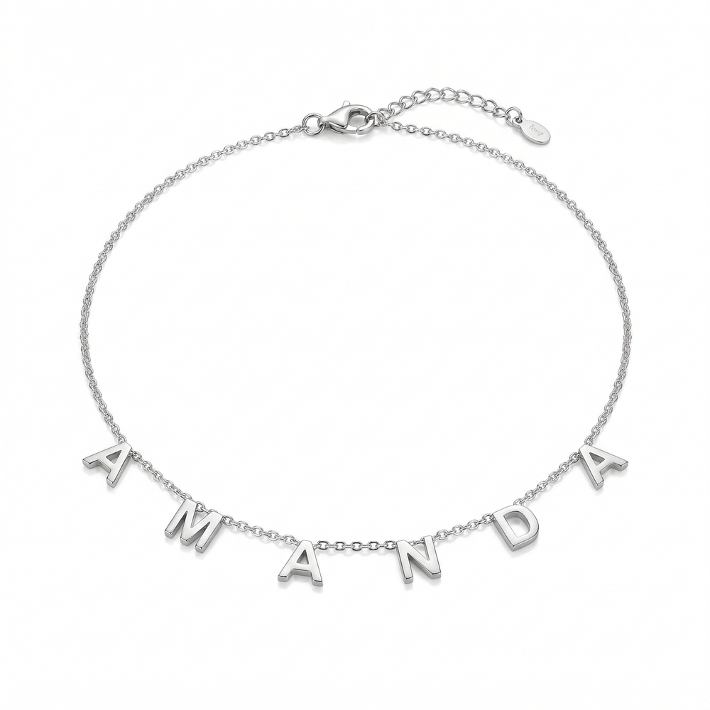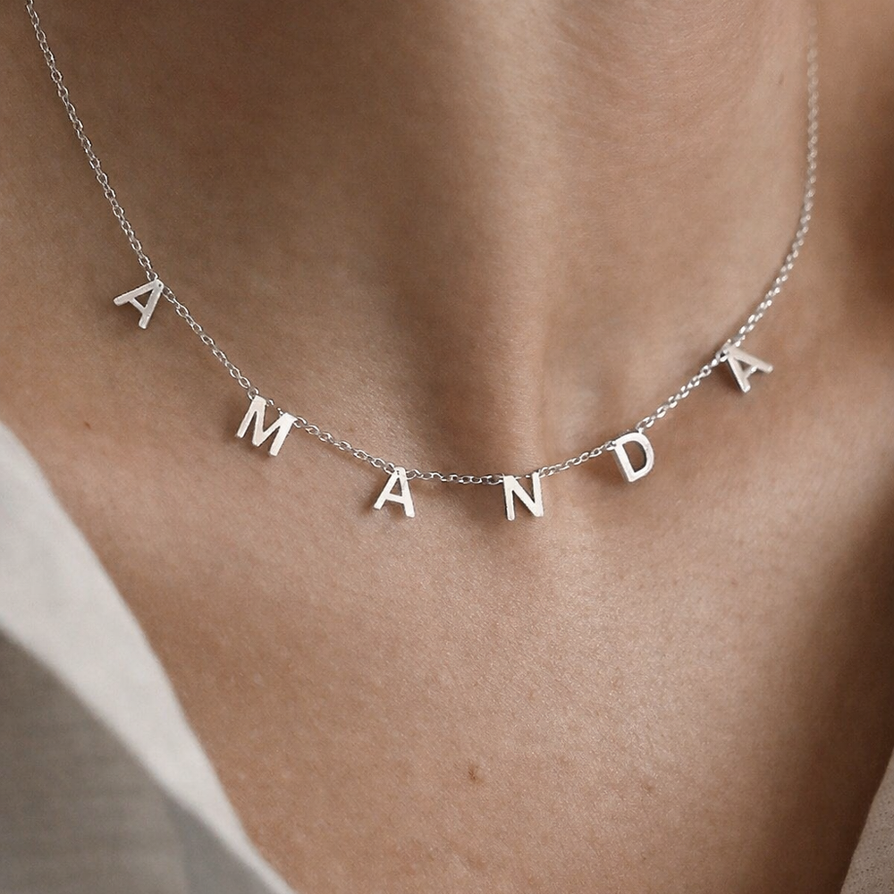 This sterling silver name dangler necklace features the name Amanda as displayed in the jewellery design, arranged in spaced letter elements along a fine chain. Crafted from premium 925 sterling silver, the design offers a clean and modern look while maintaining lightweight comfort. Its balanced structure makes it suitable for daily wear with a subtle personalized touch. Packed and quality checked by Indianshelf.