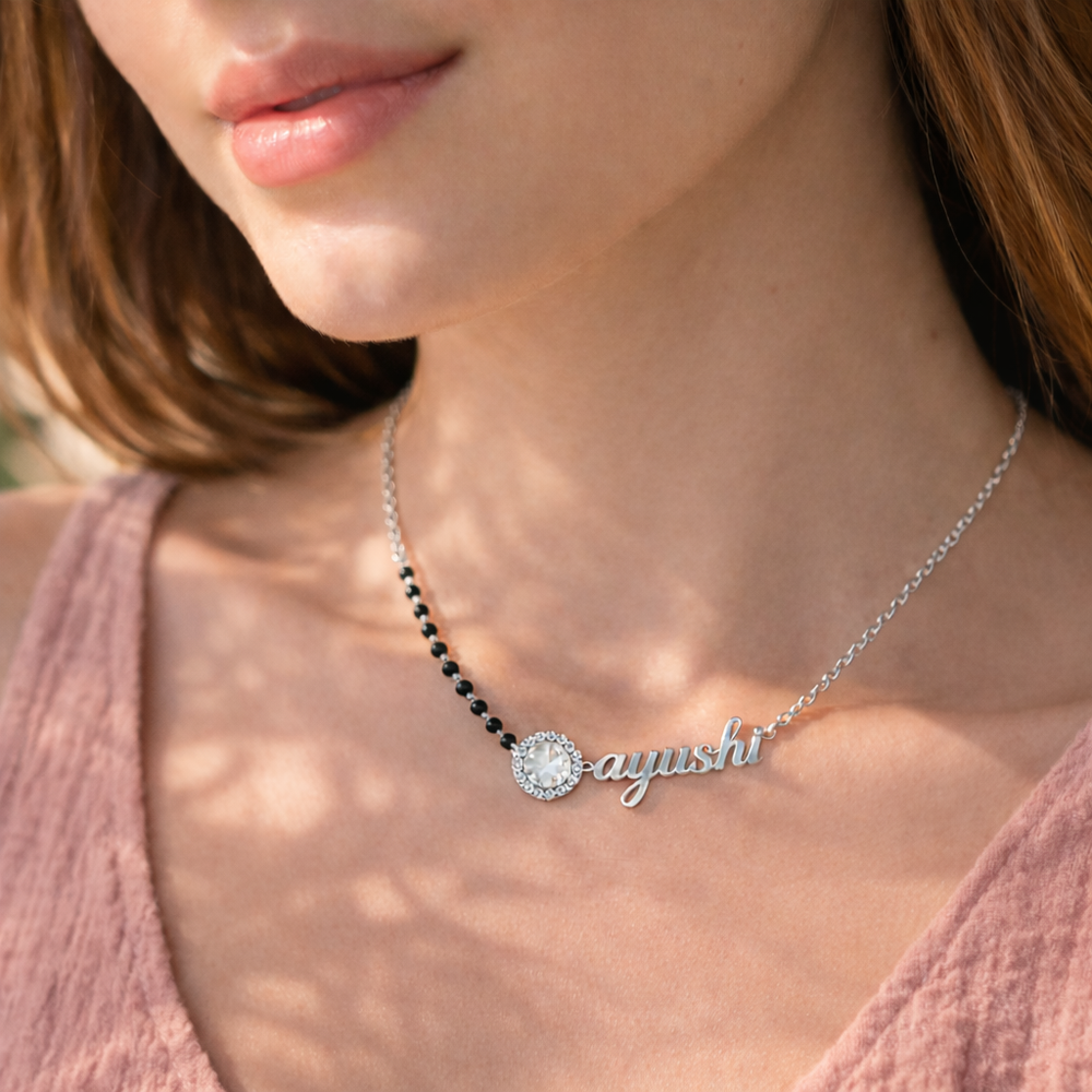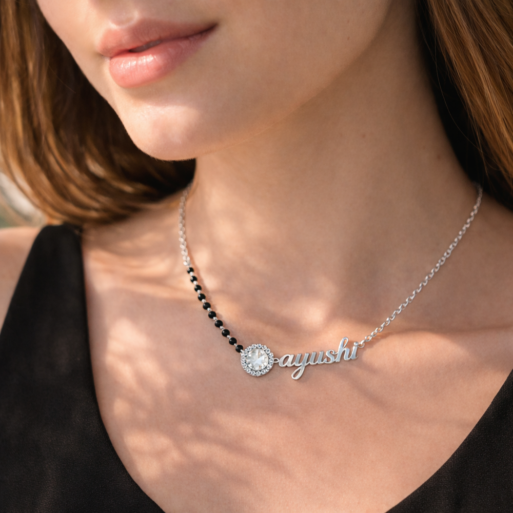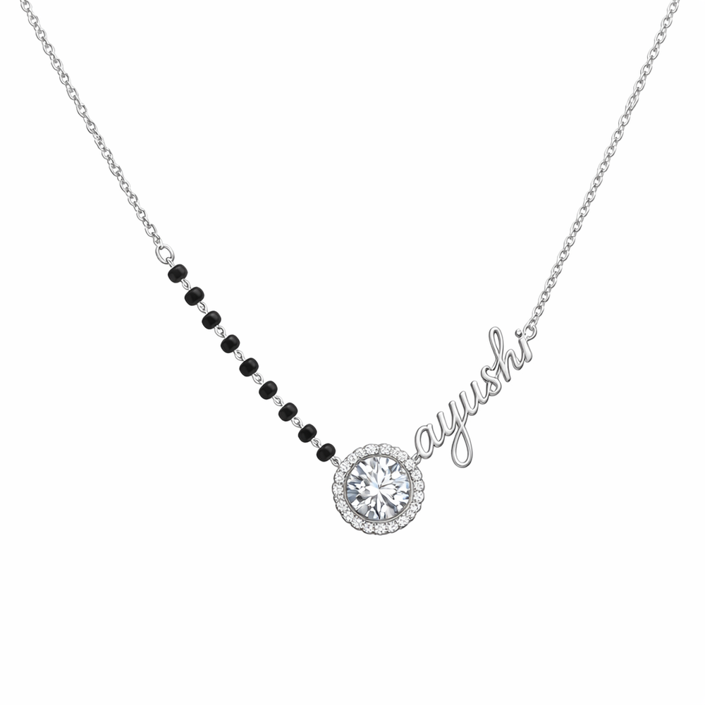 This sterling silver antique mangalsutra necklace features the name Ayushi as seen in the jewellery design, combining personalization with a refined traditional touch. Crafted from premium 925 sterling silver, it includes a central stone element with delicate detailing and a black bead chain for contrast. The balanced structure ensures comfort while maintaining elegance. Packed and quality checked by Indianshelf.