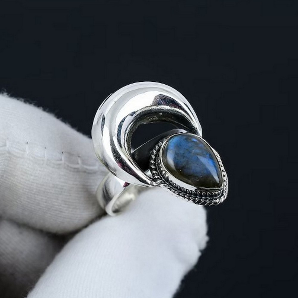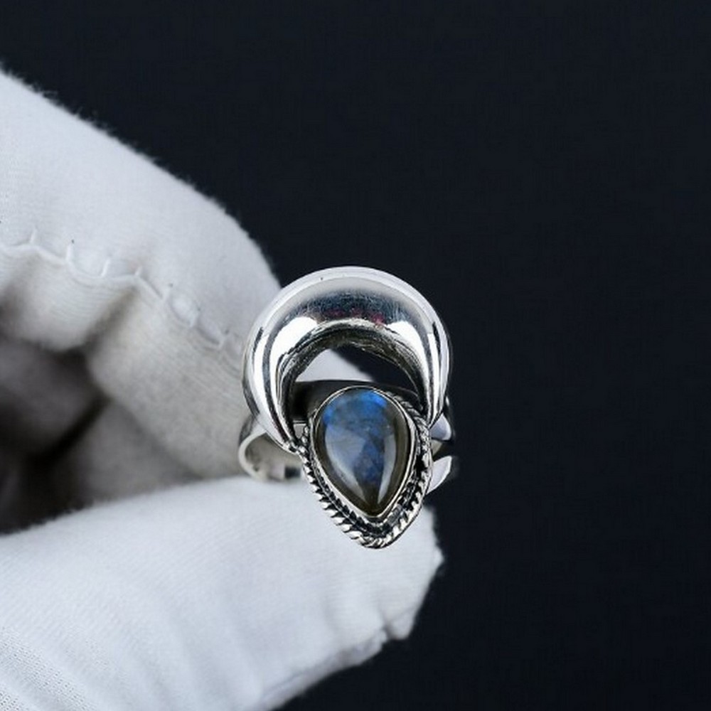 Treasure the allure of our handmade 925 sterling silver labradorite ring crescent moon design for women, where natural labradorite, 925 sterling silver and crescent moon come together to create a earthy elegance. This ring is for nature lovers, each piece reflecting individuality and care. Packed & quality-checked by Indianshelf.