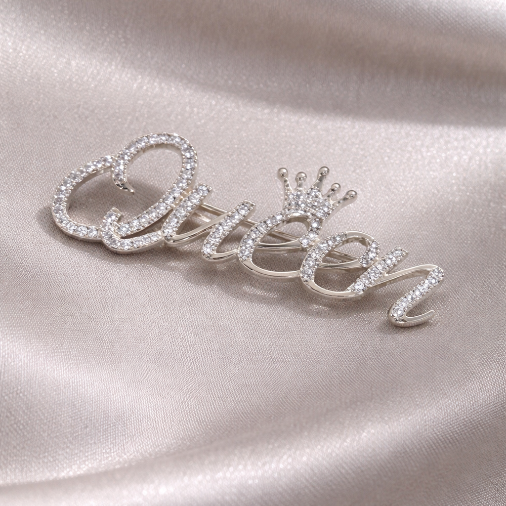 This sterling silver Queen name brooch features a crown accented letter design as shown in the jewellery piece, combining personalization with a bold visual identity. Crafted from premium 925 sterling silver, it includes detailed stone setting that enhances its brilliance. The structured pin backing ensures secure wear while maintaining a refined look. Packed and quality checked by Indianshelf.