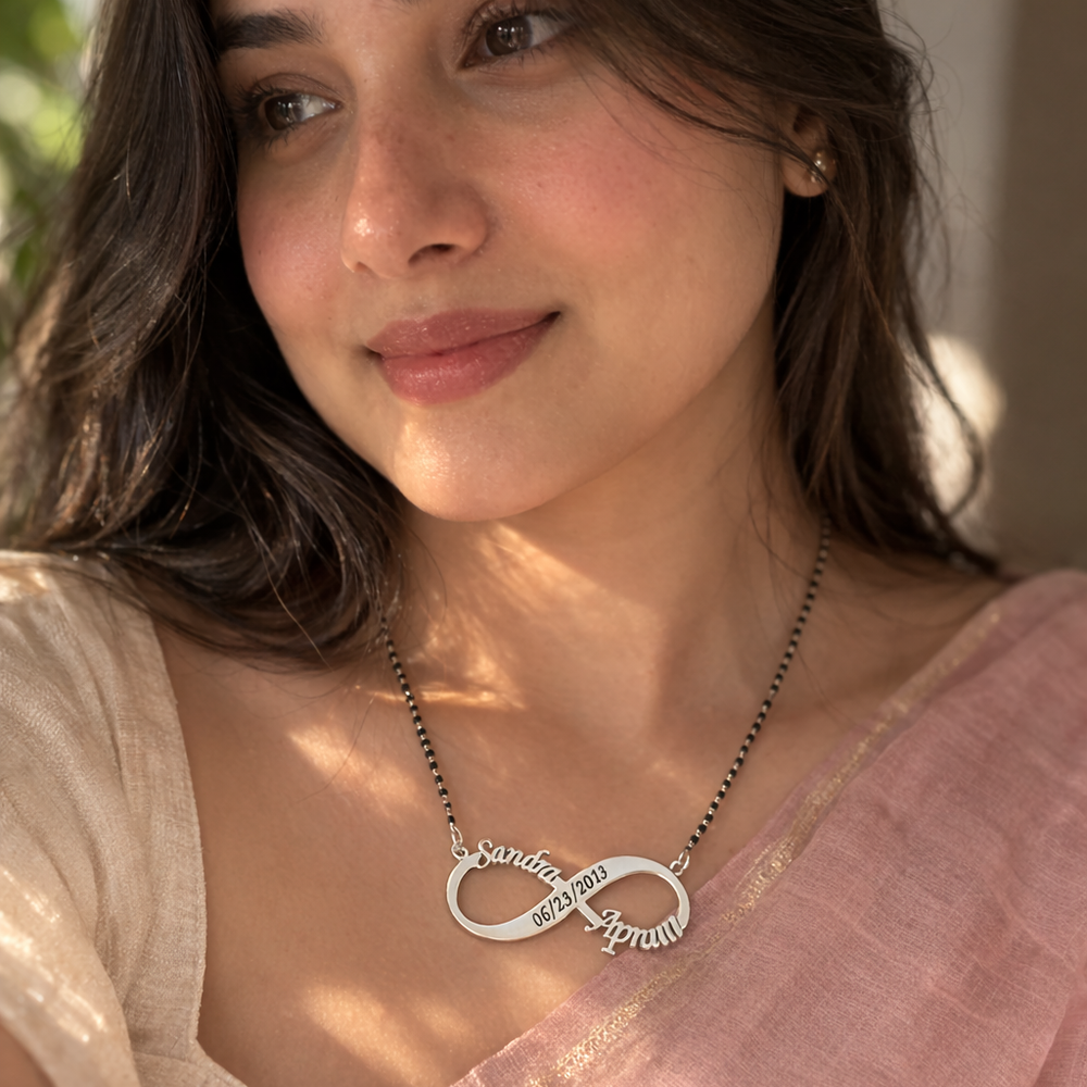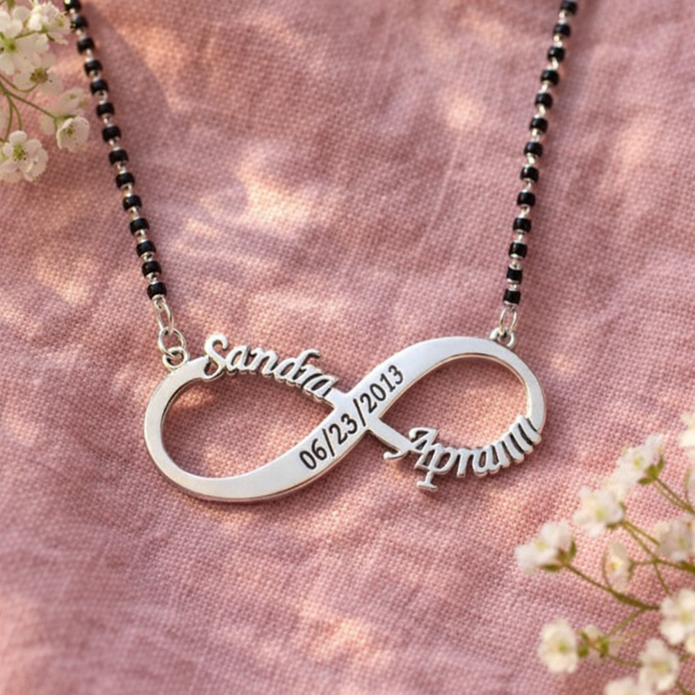 This sterling silver infinity mangalsutra necklace unites Sandra and Apram in a symbolic design representing endless connection. Crafted from premium 925 sterling silver, it features a sleek infinity motif with personalized names and a refined single layer chain. The balanced structure ensures comfort for daily wear while maintaining a meaningful and elegant presence. Packed and quality checked by Indianshelf.