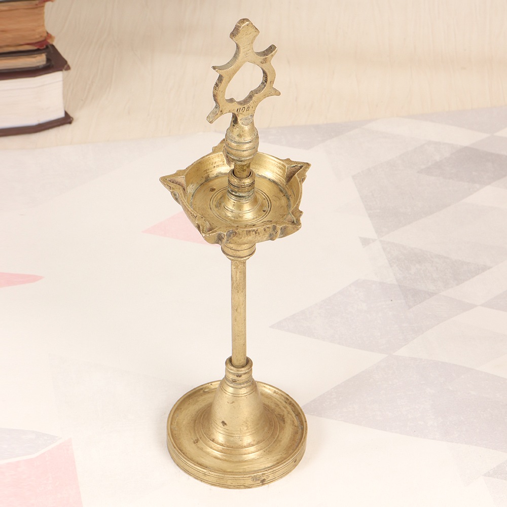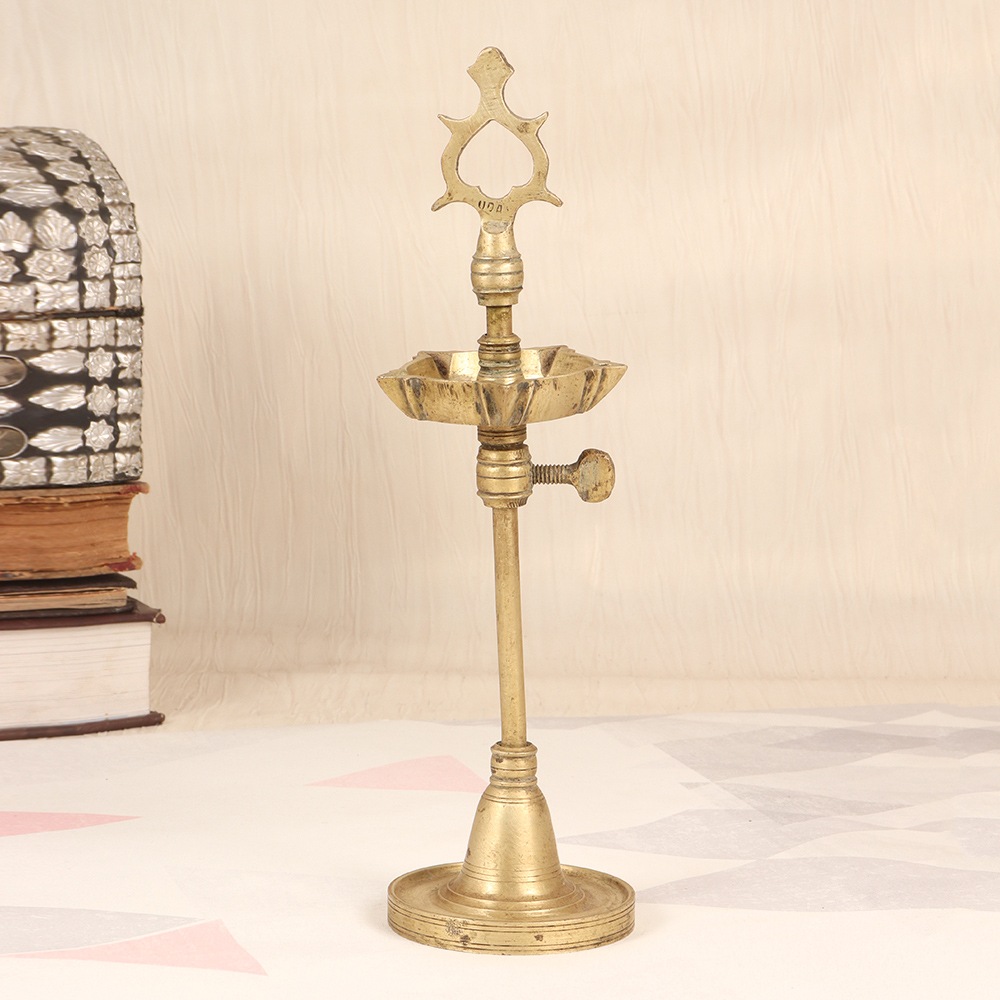 Discover the captivating allure of a vintage brass oil lamp that celebrates the rich cultural heritage of South India. Crafted with meticulous attention to detail, this heirloom-quality piece will elevate the ambiance of any space. Immerse yourself in the timeless elegance of this brass oil lamp. The soft, flickering light will transport you to a bygone era, infusing your home with a sense of serenity and cultural heritage. Whether placed on an end table, mantel, or windowsill, this lamp will effortlessly blend into a variety of interior styles, from rustic to modern. This lamp is perfect for those who appreciate the beauty of handcrafted, natural products and the rich traditions of South Indian art. Light the 5 jyots and enjoy the mesmerizing dance of the flames as you unwind after a long day or entertain guests with its warm, inviting glow. Embrace the enduring charm of this brass oil lamp and let it become a cherished centerpiece in your home, a testament to the timeless artistry of South India.