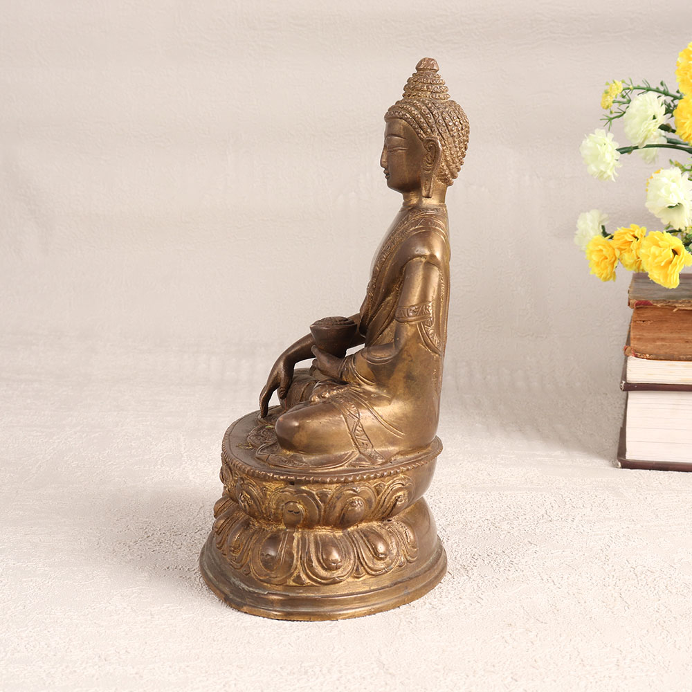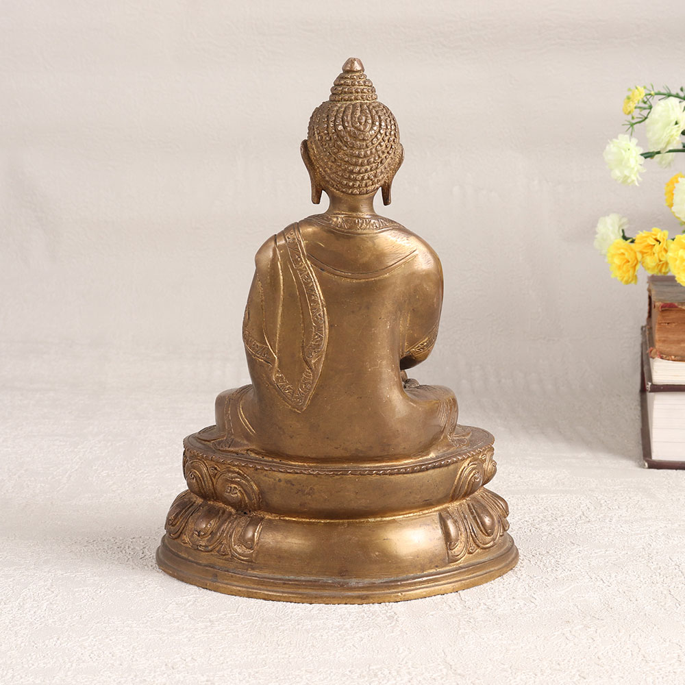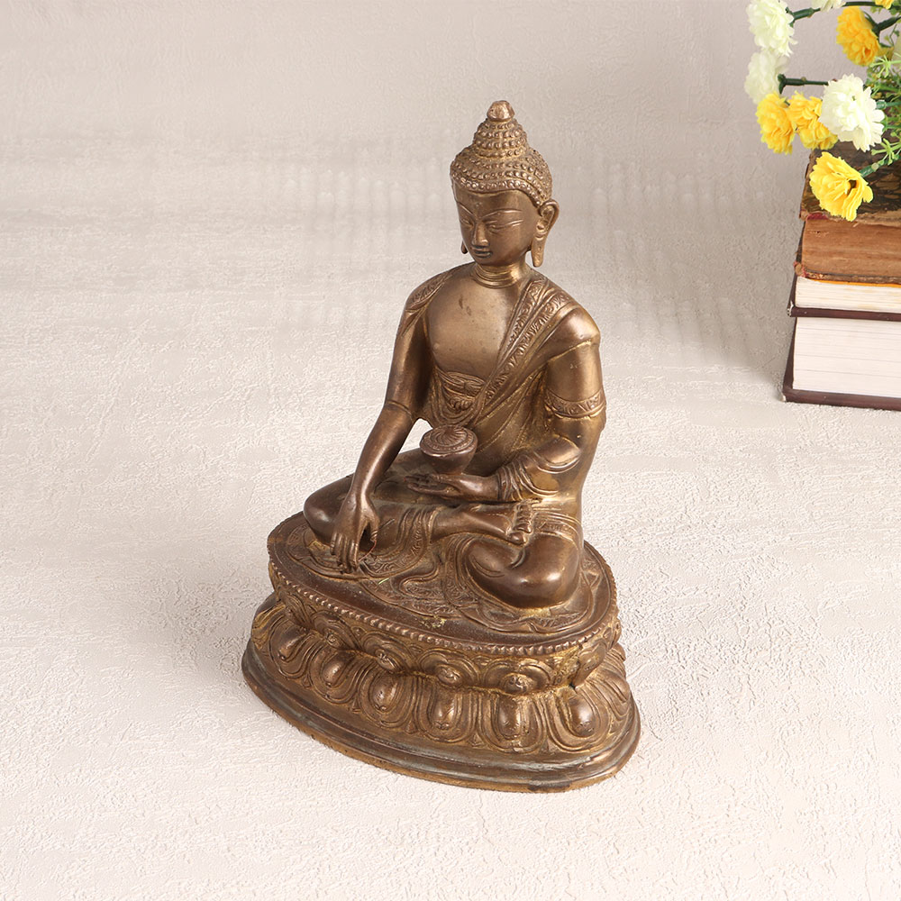 Immerse yourself in the serenity and timeless beauty of this exquisite brass statue of Lord Buddha. Seated gracefully on a platform, this crafted masterpiece exudes an aura of tranquillity and spiritual grace. Handmade by skilled Indian artisans with a deep reverence for their craft, it boasts a stunning antique brown finish that adds a touch of rustic elegance to any space. The statue's intricate detailing and high-quality brass construction make it a remarkable addition to your home, office, hotel, cafe, shop, or restaurant's prayer room. It serves not only as a source of spiritual inspiration but also as a tasteful decorative item, enhancing the aesthetics of any environment. Furthermore, it can be a cherished addition to your vintage collection or serve as a striking exhibit in art exhibitions. As a thoughtful gesture, this statue makes for a meaningful gift on special, festive, or auspicious occasions, symbolizing the blessings of peace, wisdom, and enlightenment for your family, friends or relatives.