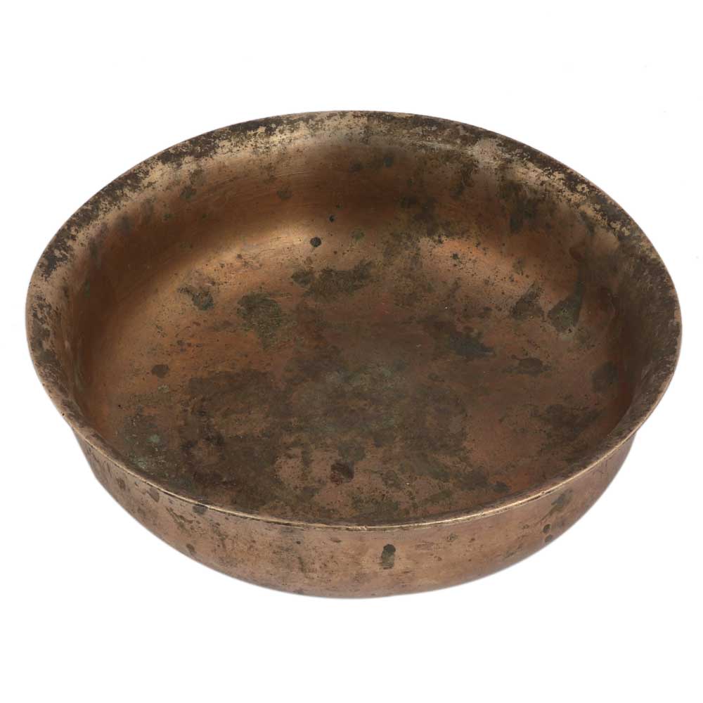 This large brass bowl was crafted by hand and has a simple design with a faint patina. Use this bowl on its own, as a decorative catchall near the front door, or as a fruit/vegetable bowl centrepiece on your dining table.