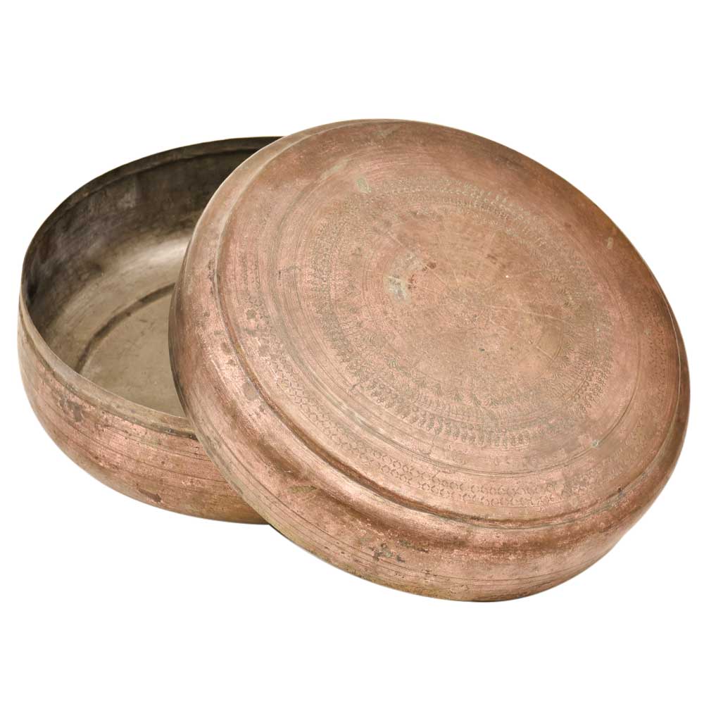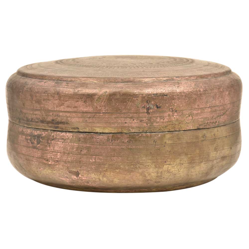 This brass storage box is round in shape with delicate carvings made by master craftsmen of India. It can be used for keeping jewelry and other valuables. It can also be gifted to friends or relatives who are fond of collecting exquisite Indian decor items.