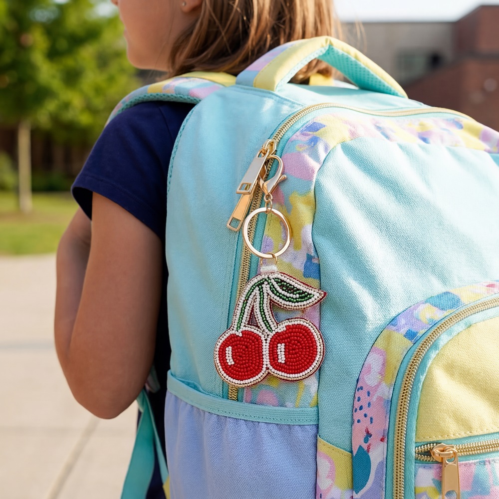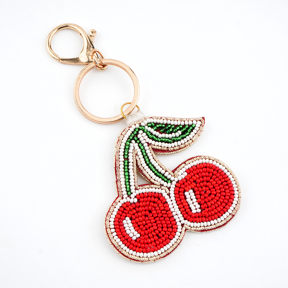 Add a playful and colorful touch to your keys, bags, or backpacks with this handmade beaded cherry keychain. Carefully crafted with vibrant red, green, and white beads, this charming fruit design brings a fun and stylish accent to everyday accessories. The sturdy metal clasp and ring make it easy to attach to keys, purses, handbags, or backpacks. Lightweight yet durable, this cherry charm is perfect for gifting or adding a unique decorative detail to your personal items.