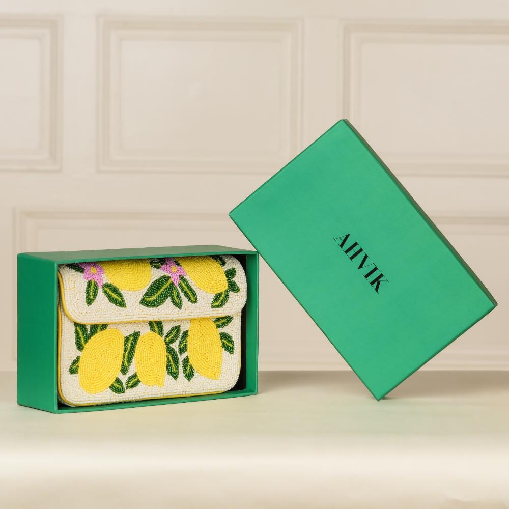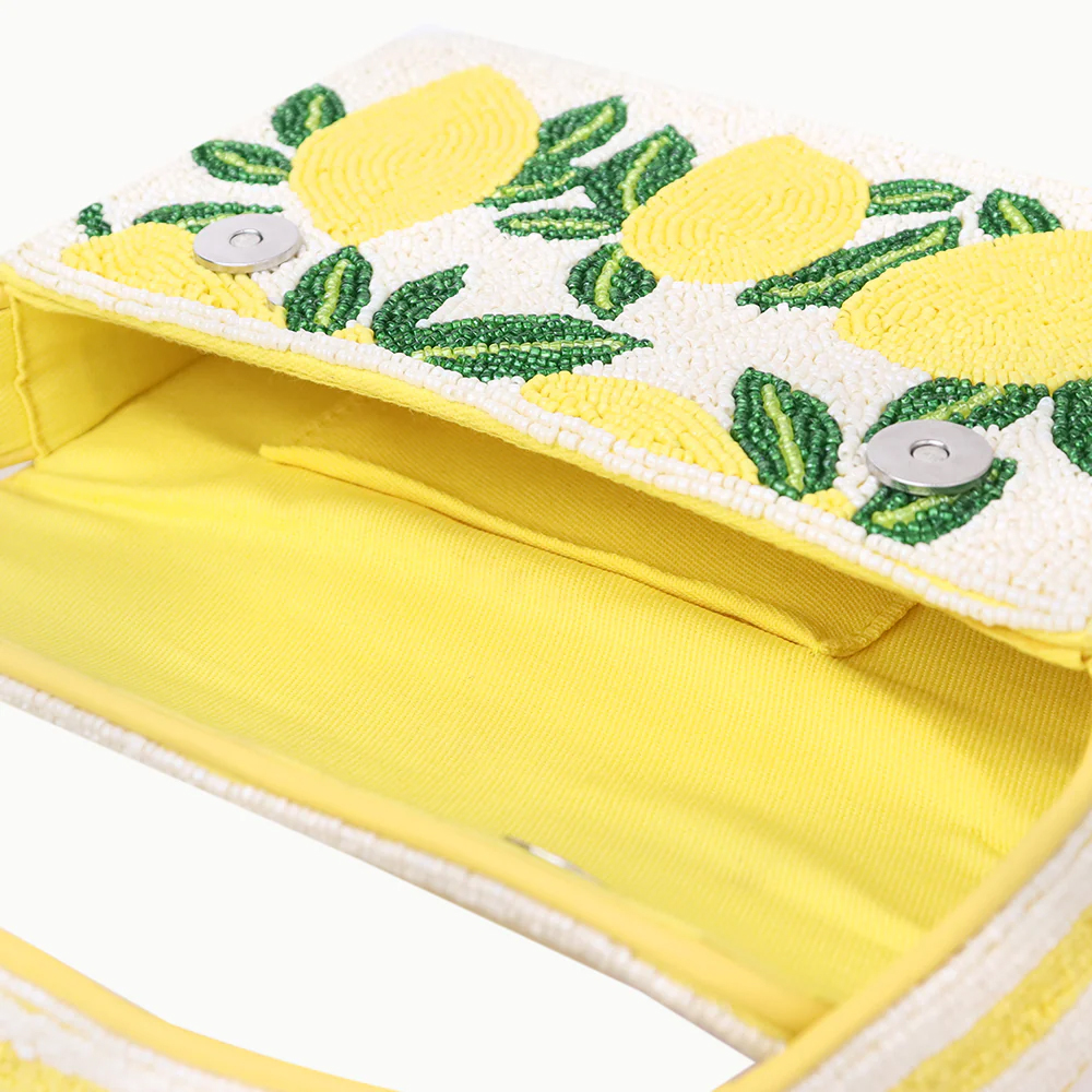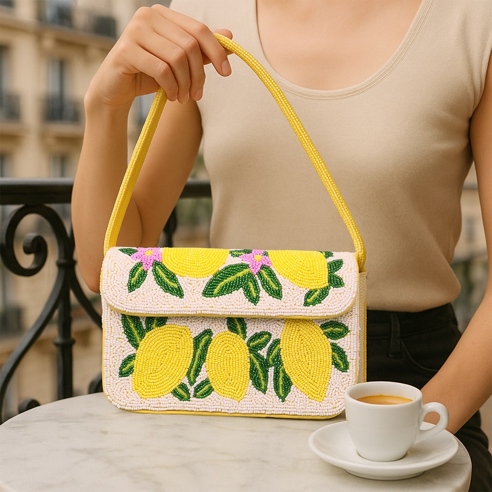 Bring a burst of sunshine to your wardrobe with this vibrant Lemon Beaded Shoulder Bag. Adorned with hand-embroidered yellow lemons, lush green leaves, and pops of pink floral detailing, this bag captures the spirit of summer in every stitch. The beadwork is set against a soft cream base with matching yellow strap lining, creating a refreshing and lively look. Perfect for vacations, brunches, or casual outings, it adds a cheerful statement to any outfit.