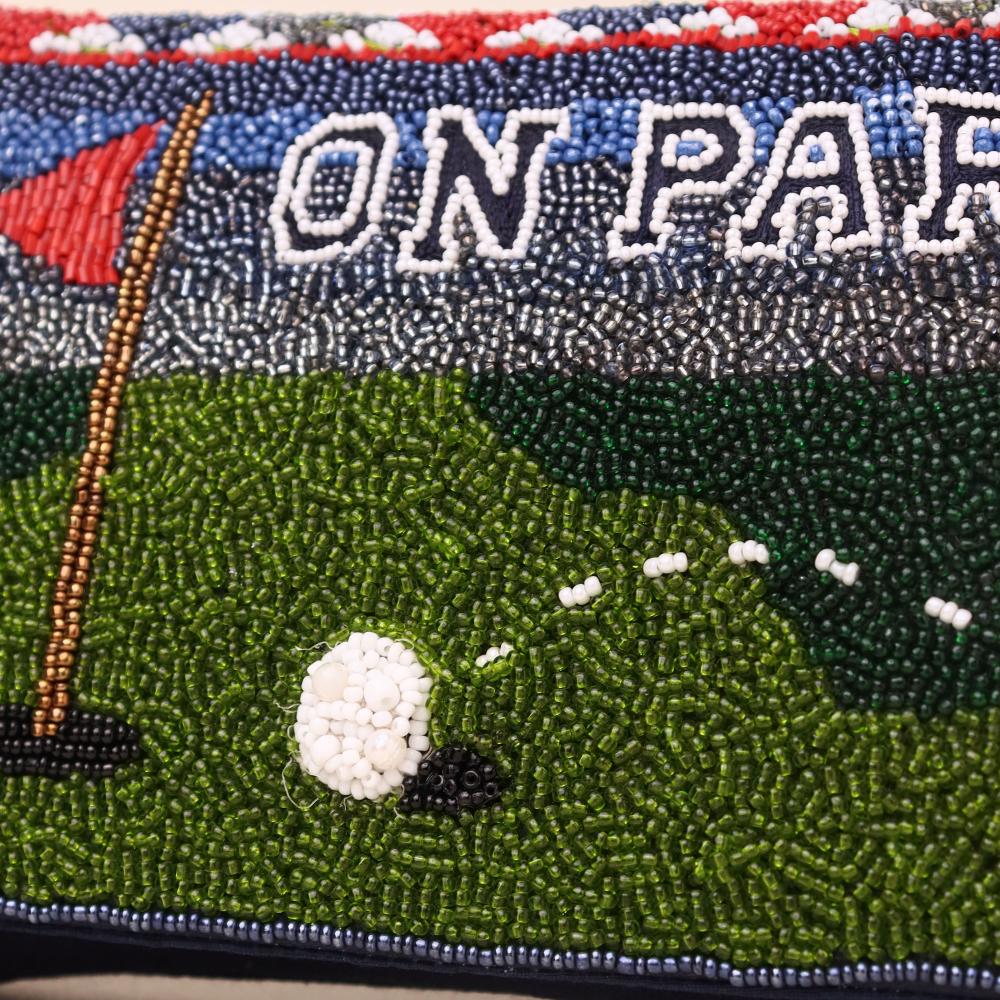- Design Pattern: Handmade with intricate bead embroidery depicting a golf course design with the phrase “On Par!”
