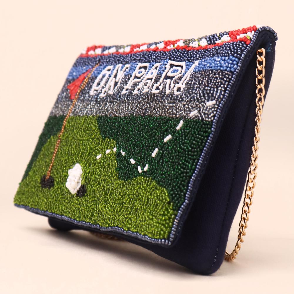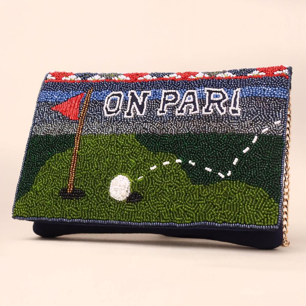 Stand out in style with this unique handcrafted beaded sling clutch, designed for golf lovers and fashion enthusiasts alike. Featuring an intricate beadwork pattern that beautifully captures a golf course scene with the words “On Par!”, this bag adds a playful yet elegant touch to any outfit. The compact size makes it perfect for carrying your essentials, while the detachable chain strap offers versatile styling – wear it as a crossbody, sling, or carry as a chic clutch.Crafted with precision and attention to detail, this statement accessory blends artistry and function, making it a perfect pick for parties, casual outings, or gifting.