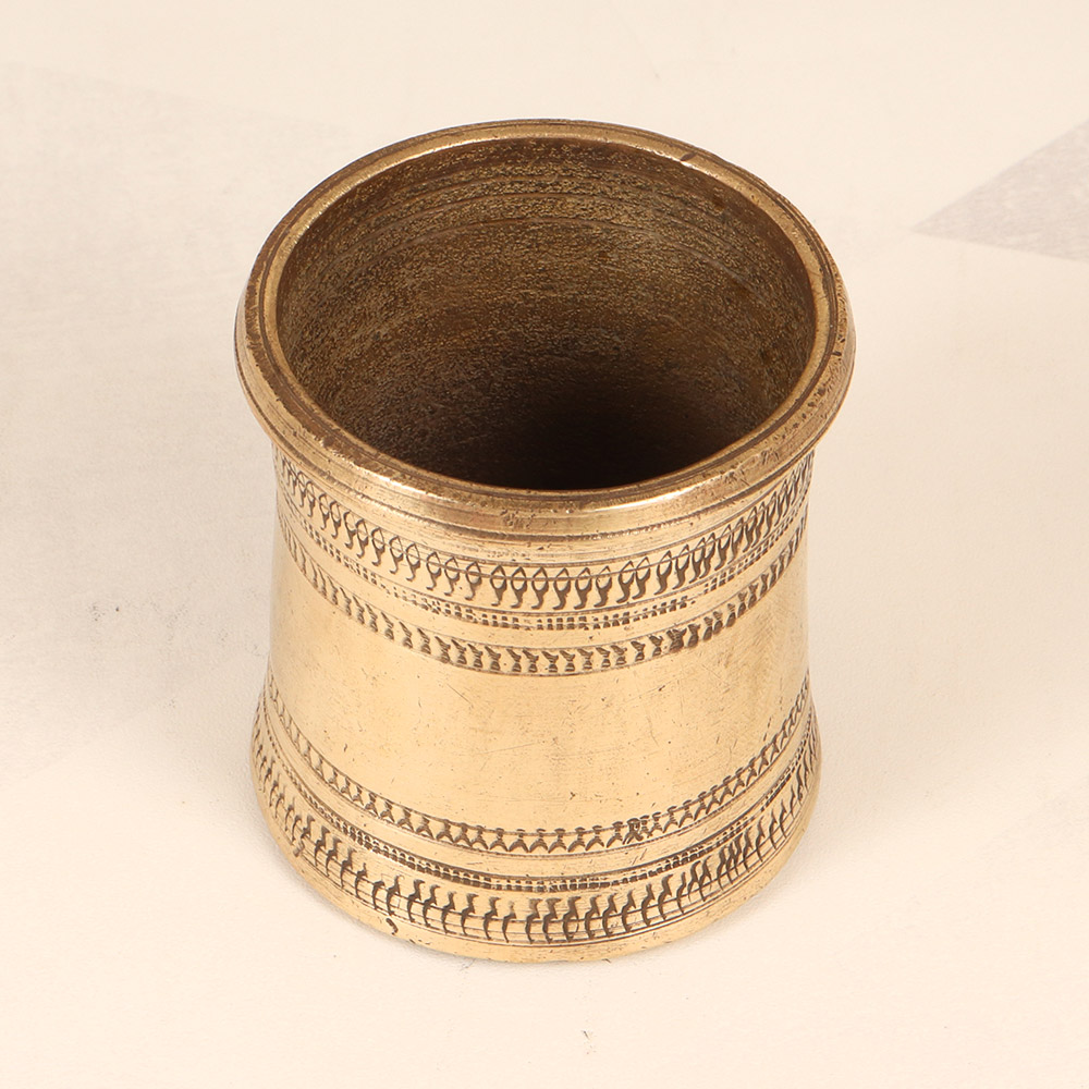 Elevate your sacred rituals and infuse your space with the timeless elegance of this exquisite brass Panchpatra pot. Crafted by skilled artisans, this heirloom-quality piece is a testament to the rich artistic heritage of South India, featuring intricate carvings that will captivate and inspire. As you incorporate this Panchpatra pot into your sacred rituals, you'll be transported to a realm of profound spiritual significance. Imagine the warm glow of the brass as you fill it with water, flowers, or other offerings, the mesmerizing carvings casting shadows that dance across your space. Each use will be an opportunity to slow down, connect with your inner self, and honor your spiritual practice. Whether you're looking to elevate your personal meditation routine, create a captivating centerpiece for your home altar, or seek a meaningful gift for a loved one, this Panchpatra pot is an investment that will be cherished for generations. Unlock the timeless allure of South Indian art and bring the beauty of ancient tradition into your life.