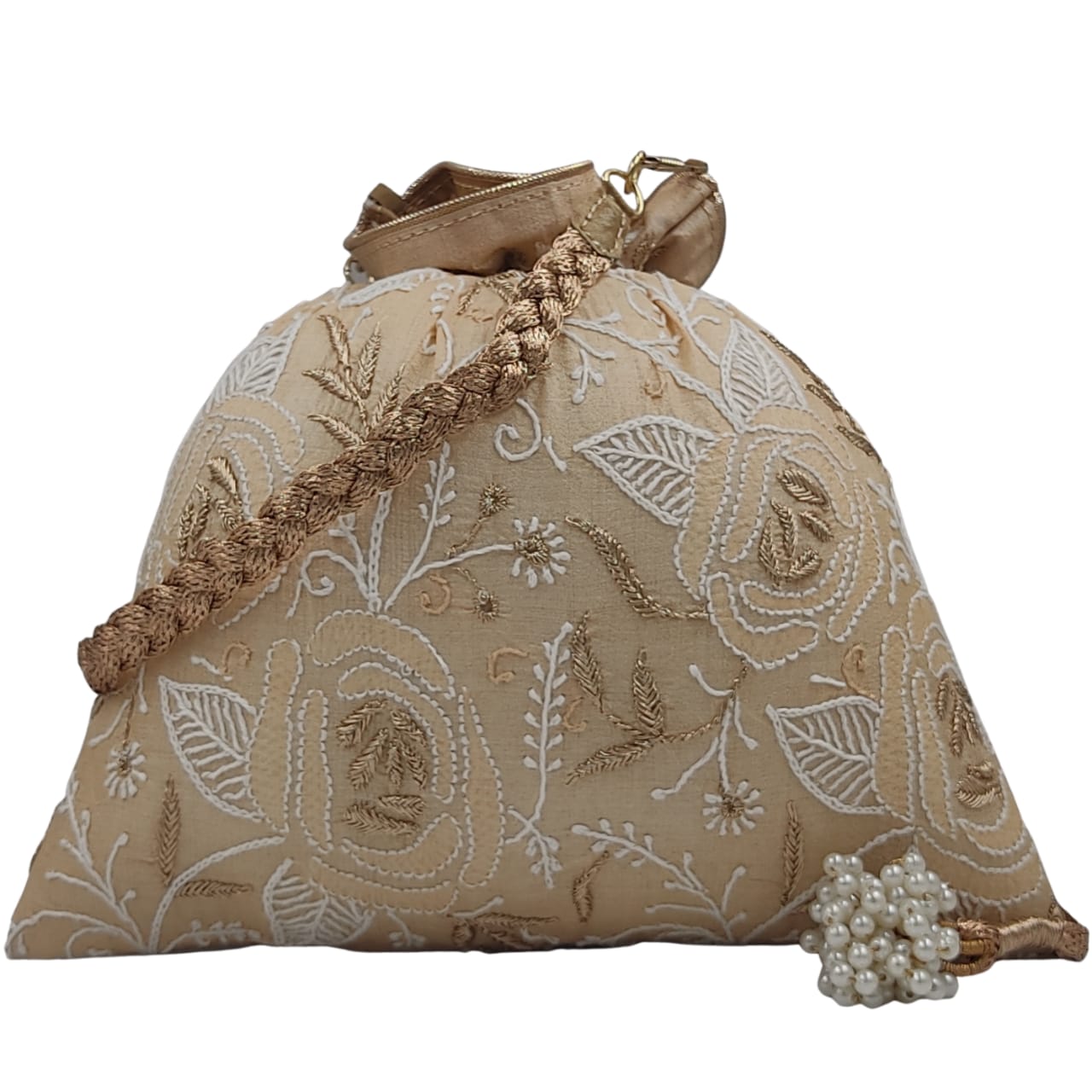 Add a touch of timeless elegance to your ensemble with this beautifully handcrafted potli bag, made from luxurious tussar silk in a soft beige hue. Intricately adorned with delicate Chikankari embroidery on both sides, the design features elegant floral and leaf motifs brought to life with fine white thread and shimmering gold kasab highlights. The bag includes a sturdy braided handle and a traditional drawstring closure, finished with pearl cluster hangings at both ends for an extra dash of charm. Its sophisticated color palette and rich craftsmanship make it a perfect accessory to pair with sarees, suits, or Indo-western outfits. Lightweight yet spacious enough for your essentials, this potli combines function with festive flair. Whether you're attending a wedding, festive celebration, or special evening out, this potli bag is the ideal companion to elevate your ethnic look with grace and style.