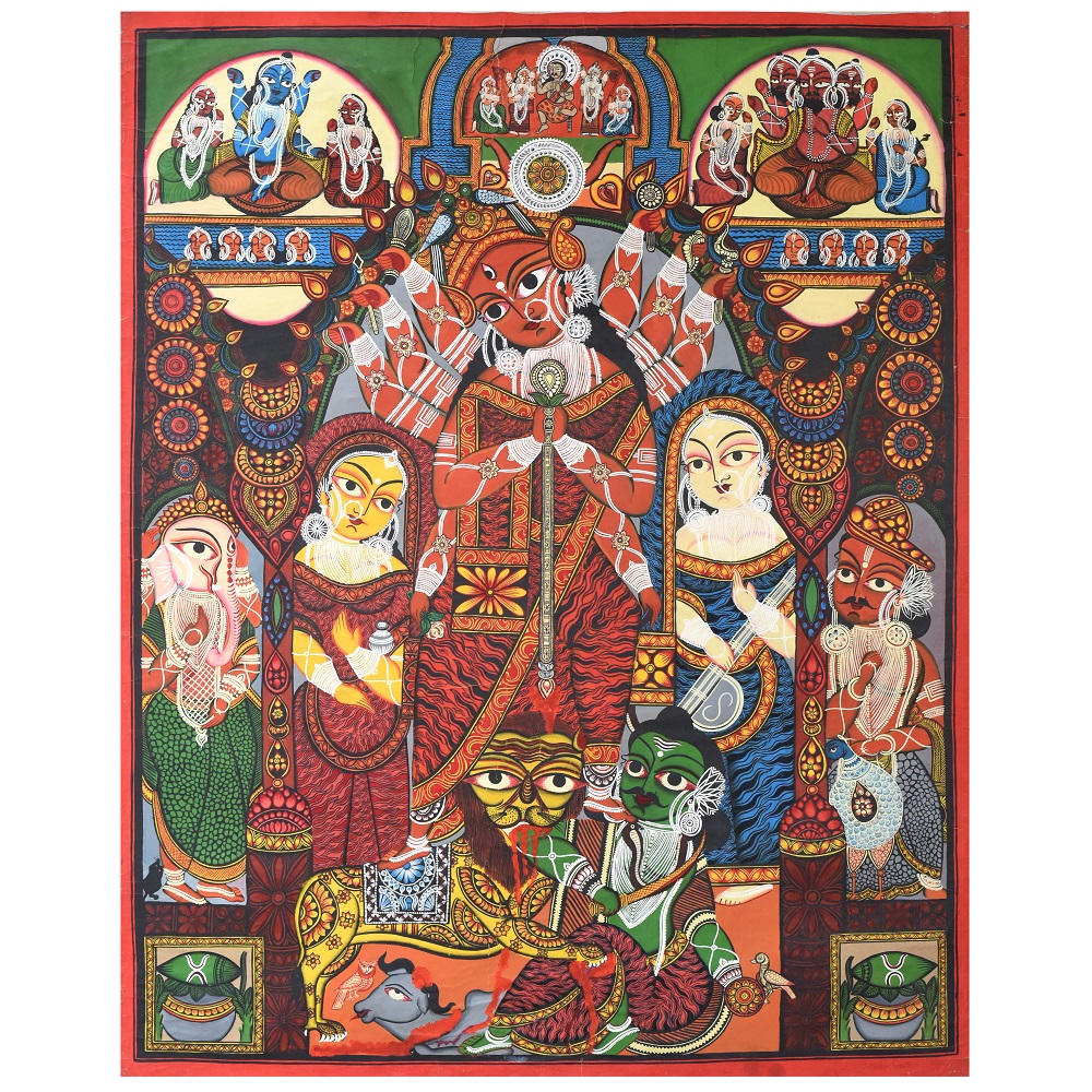 This handcrafted Kalighat painting is an authentic celebration of Bengal’s folk-art tradition, embodying both devotional symbolism and cultural heritage. At nearly 8 feet tall, the artwork becomes a commanding presence in any space, narrating stories of divine power, mythological grace, and everyday spirituality. With vivid reds, earthy greens, and bold outlines, the painting reflects the sacred aura of goddess Durga and her attendants, designed to inspire reverence while elevating interiors with timeless artistry. Each brushstroke honors the legacy of Indian artisans who keep this 19th-century painting tradition alive.