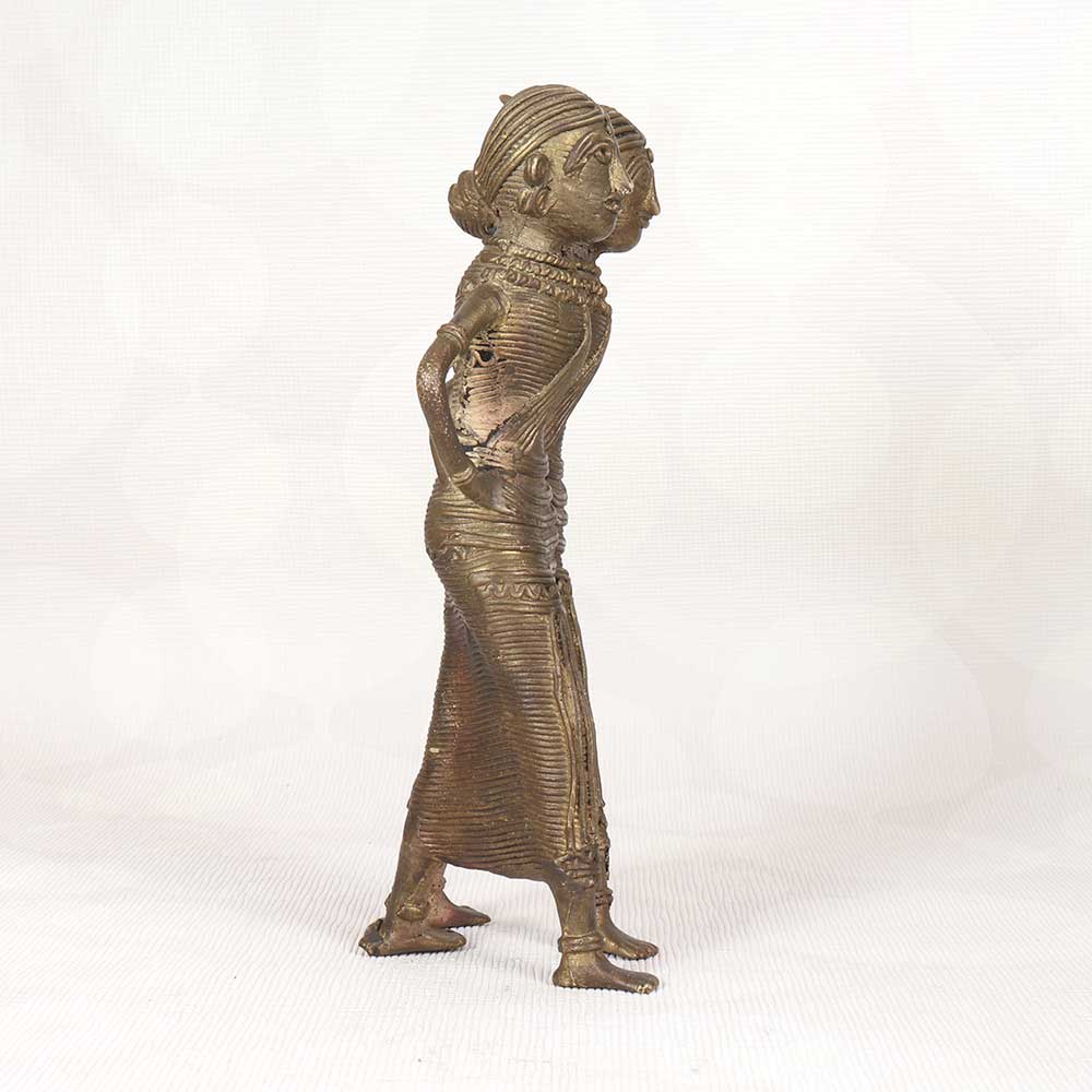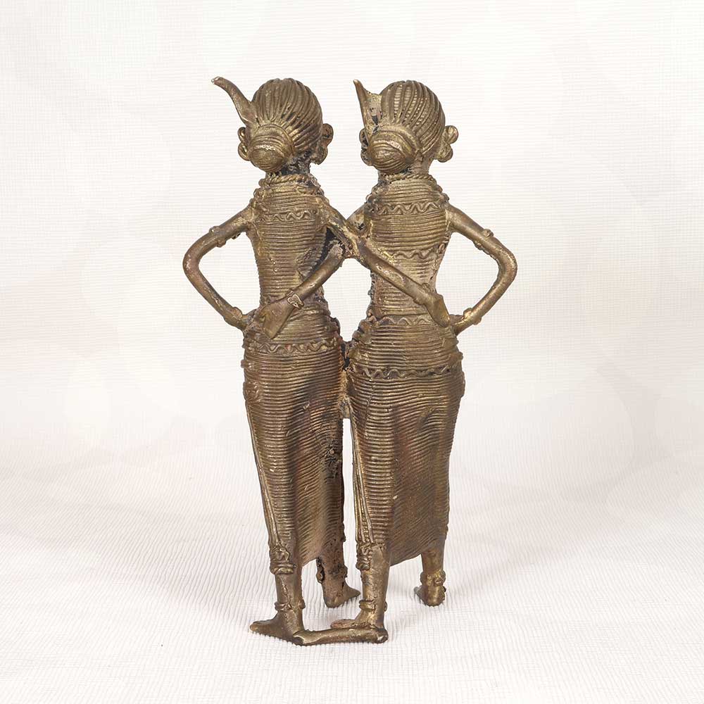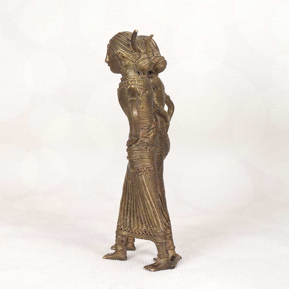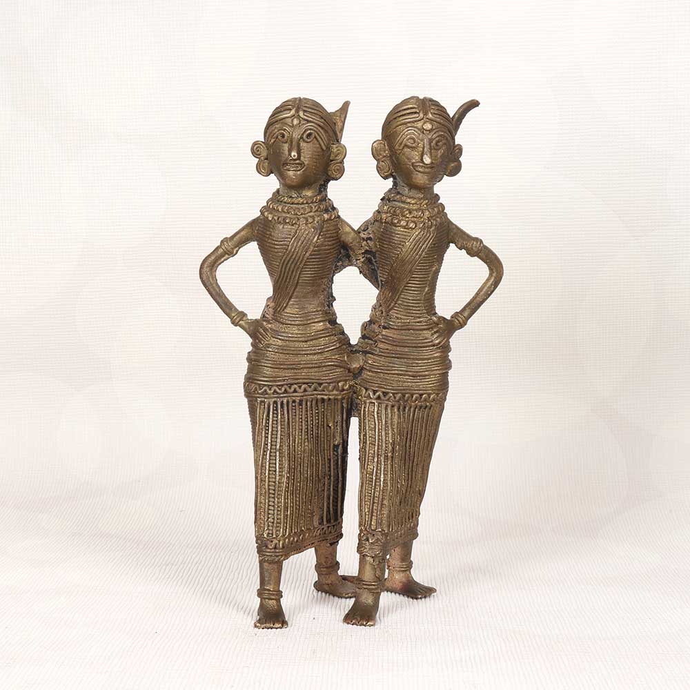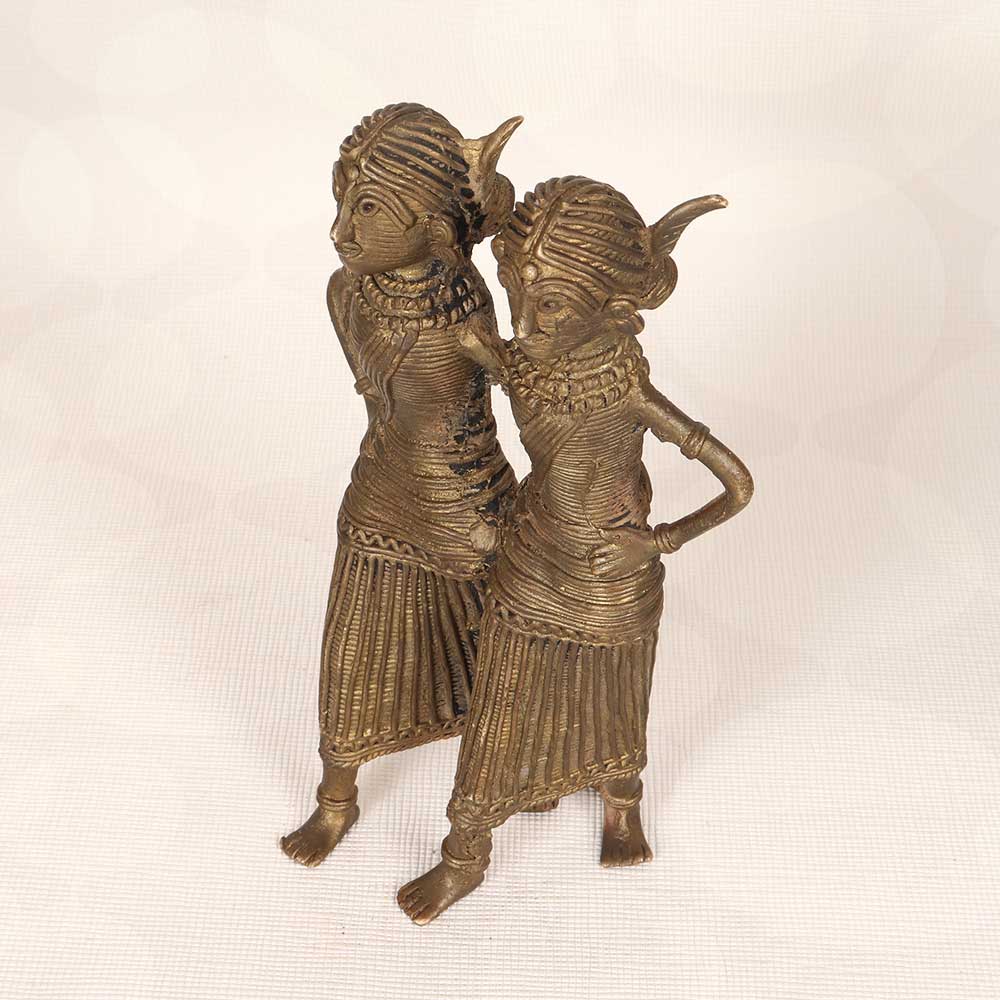 This striking vintage brass statue depicting two Indian ladies is a decorative find for the culturally curious. Showcasing incredible Bengali metalwork, it features two figures standing back to back, their bodies and saris intricately sculpted. The sculptural quality and expressive detail of this statue provide a window into India's artistic heritage. It makes a conversation-starting addition to any space, from mantels to patios. The golden brass tones add warmth, shining in indoor or outdoor settings. If you want an accent piece that goes beyond the ordinary, this vintage two lady statue is it. The cultural style and artisanal craftsmanship are a captivating combination that gives decor depth and elegance. Let this brass statue infuse your home with exotic, old-world charm.