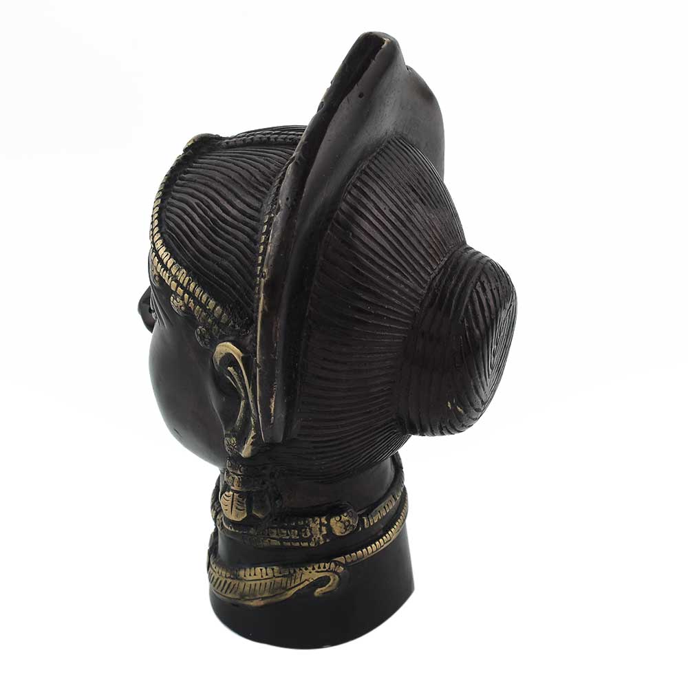 This handcrafted goddess Gangaur Gauri face in solid brass can be used indoors or out, and can be placed on the wall shelf, near the entry or in the puja area. It has a black varnish making it a vintage-style décor item.
