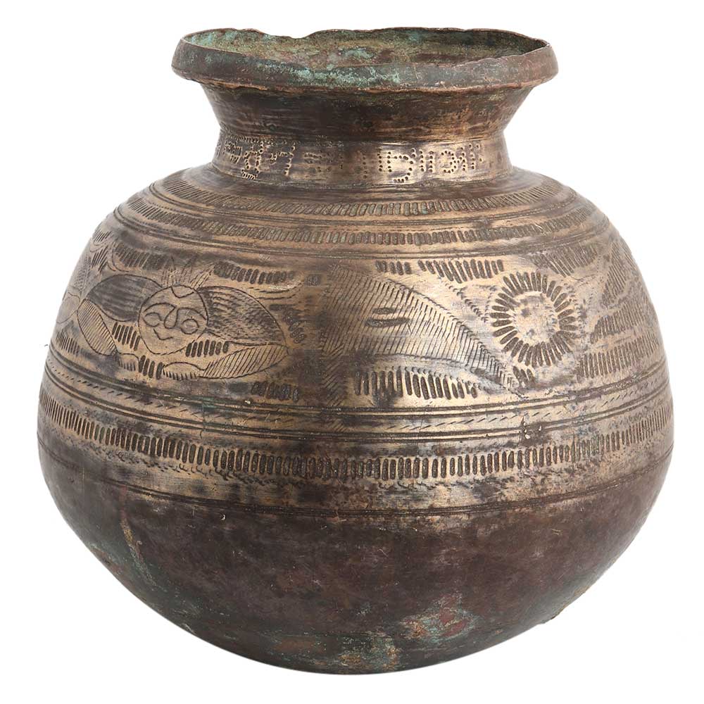 This brass jal pot with an old-aged patina and carved with images of god by the master craftsmen is suitable for kitchen, table, or home decor. It serves as a great gift for the inauguration of the house.