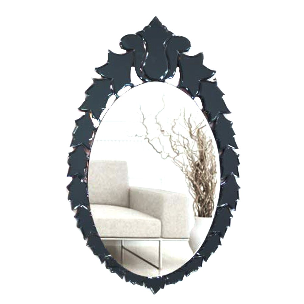 This is a perfectly hand-carved black frame Oval Venetian Mirror with delicate leaf-like details in high relief. The frame has a beautiful shield outline, supporting a mirror with beveled edges.
