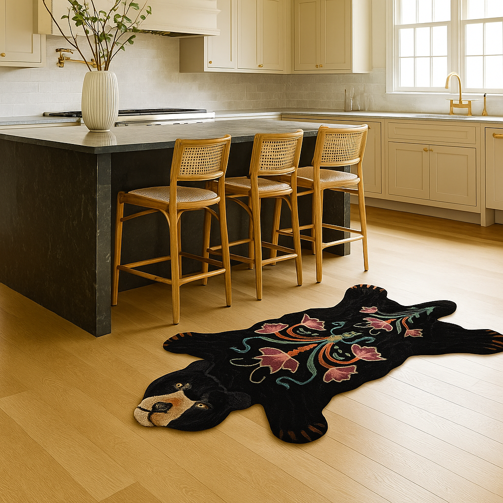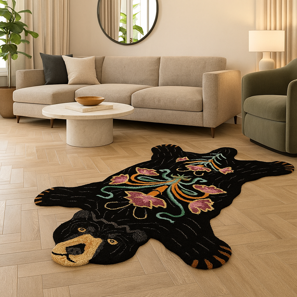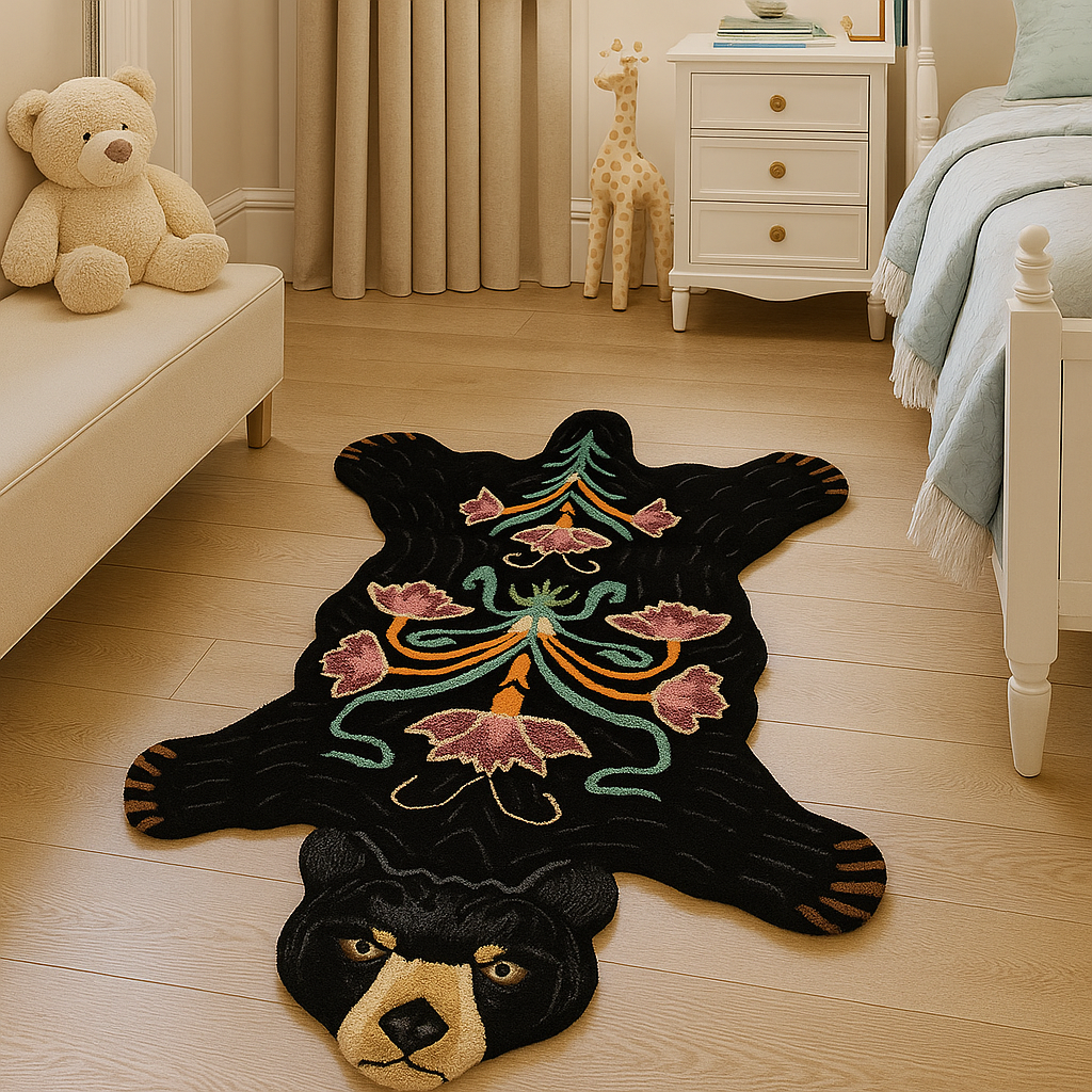This flowering black Bear rug is hand tufted from dyed genuine sheep wool. Designed and developed in a small workshop, skilled artisans ensure the highest quality. Each detail, stripe, and dot is added with extreme care. Add a charming animal rug to your living space! Rather than hunting animals, we depicted them in carpets by tradition. These animal skin rugs add a touch of whimsy and charm to any room. Perfect for friends and family.