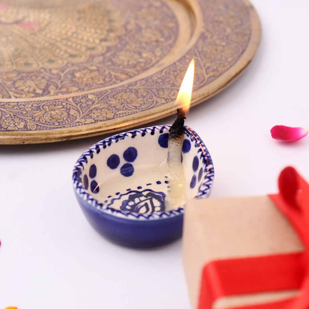 Light holds a sacred place in every home, and this handmade blue and white ceramic Diya brings that radiance alive with artistry and devotion. Crafted with precision and painted in intricate patterns of cobalt blue, it carries both elegance and tradition in its flame. The glossy ceramic surface enhances its glow, while its delicate teardrop form symbolizes purity, prosperity, and spiritual calm. Perfect for your mandir or festive décor, this diya is a true reflection of Indian craftsmanship.