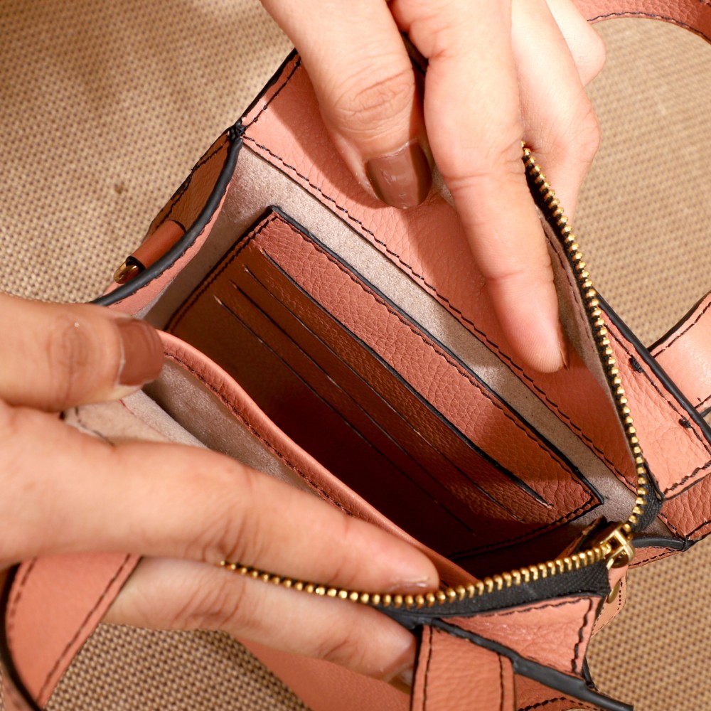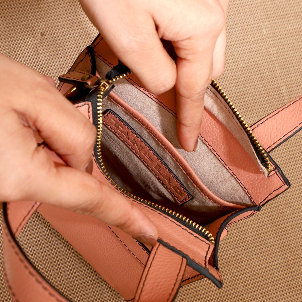 Crafted in beautiful Blush leather. Despite its petite size, this sling/crossbody bag doesnt skimp on features. The secure zipper closure ensures your belongings are safe, while the interior houses a zip pocket and a utility pocket. It offers enough space to carry select mobile phones, some currency, and your favourite lipstick.