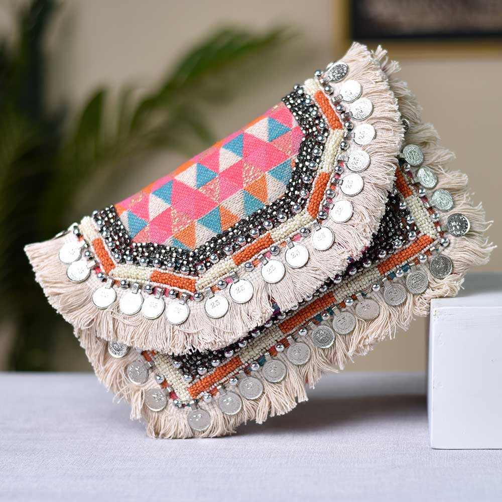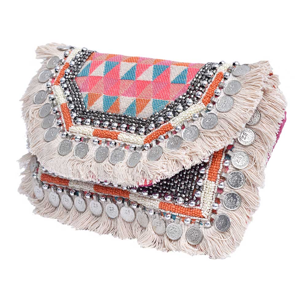 This vintage sling bag is made of mixed cotton fabrics that have hand-embroidery by the Banjara embroidery technique. Inside, there is one zippered pocket. The bag has a flap and a magnetic snap button. Spice up your festive look by wearing these as a clutch or cross body bag with your contemporary clothing for a fun Boho vibe. Perfect for personal use or gifting.