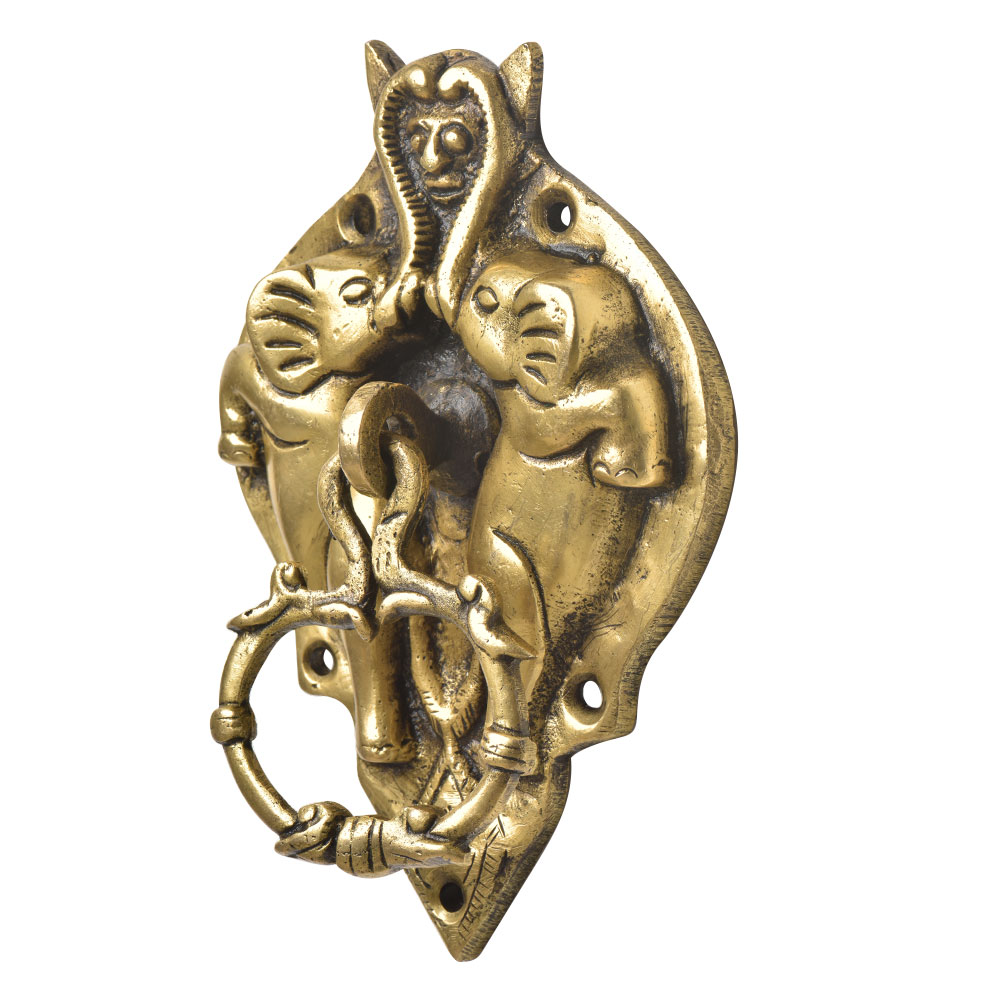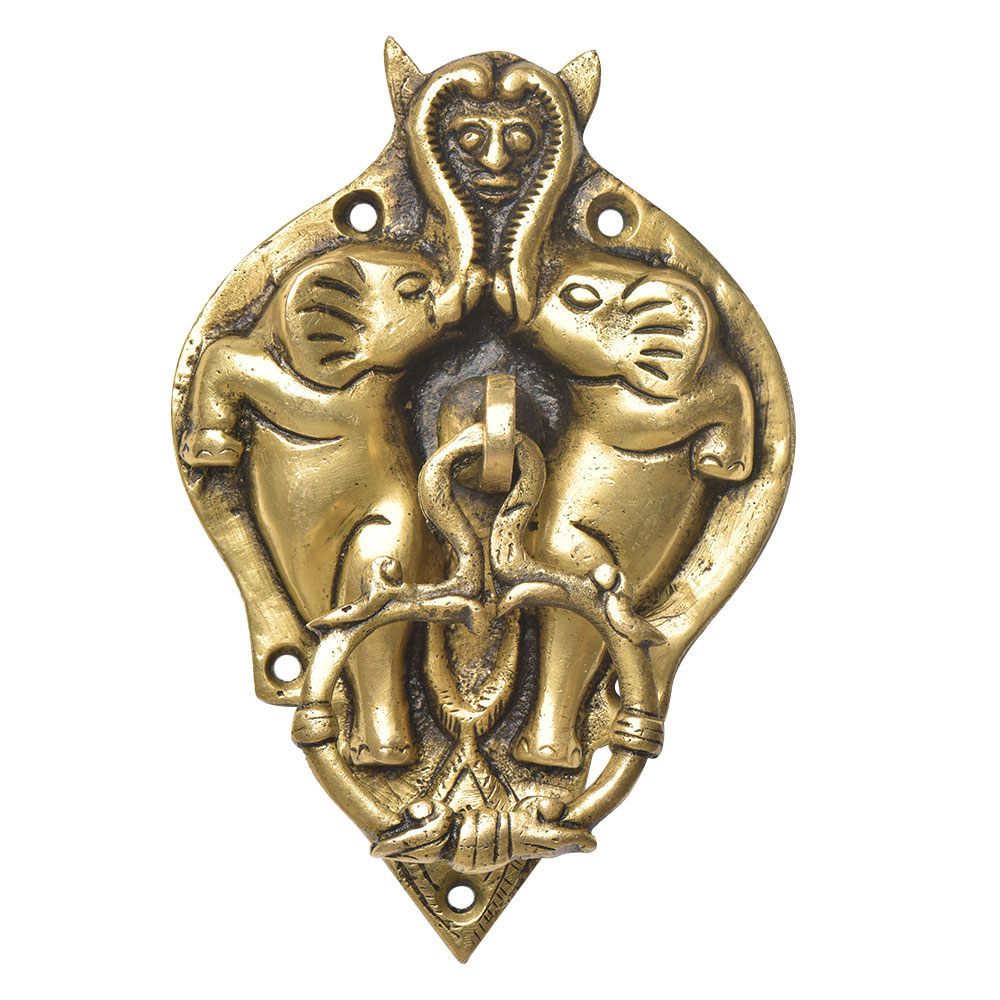 A very heavy and decorative brass knocker with the demons face on top and two elephants on both sides with the knocker attached to the centre of the strike plate. An elegant vintage decor item.