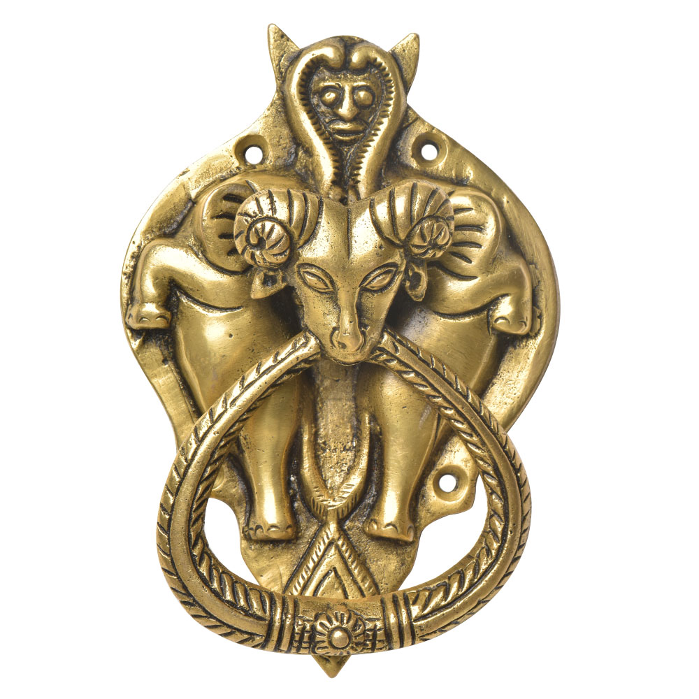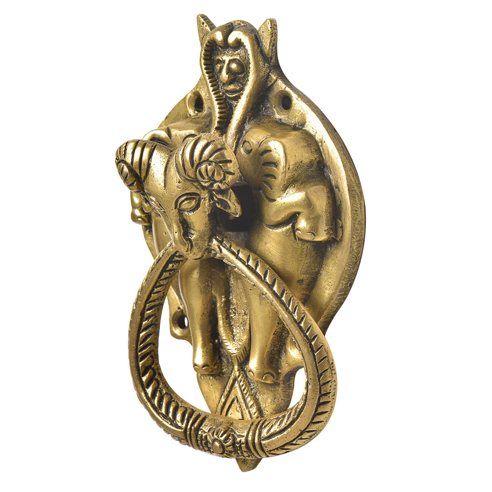 A very heavy and decorative brass knocker with the demons face on top and two elephants on both sides with the knocker attached to the Ram head with a strike plate. An elegant vintage decor item.