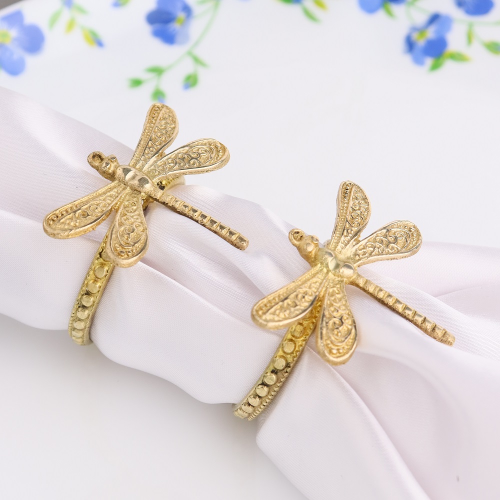Add an elegant touch to your dining experience with our exquisite set of 4 Brass Napkin Rings, adorned with charming Dragonfly motifs. Crafted by talented Indian artisans, each napkin ring is a testament to the rich heritage of craftsmanship and attention to detail. The antique golden finish adds a touch of sophistication, making these napkin rings a perfect complement to any table setting. Handmade from high-quality brass, these napkin rings not only serve as a practical table accessory but also double up as beautiful pieces of art. The Dragonfly design symbolizes wisdom, strength, and good luck, making them a meaningful addition to your dining decor. These versatile napkin rings are perfect for both casual family dinners and formal gatherings. They hold napkins in place, preventing them from slipping off the table and adding an element of finesse to the overall presentation. Beyond their functional use, these brass napkin rings make for a thoughtful and cherished gift for your loved ones. Whether it's a special occasion or a festive celebration, these exquisite napkin rings are a unique and heartfelt present that will be cherished for years to come.